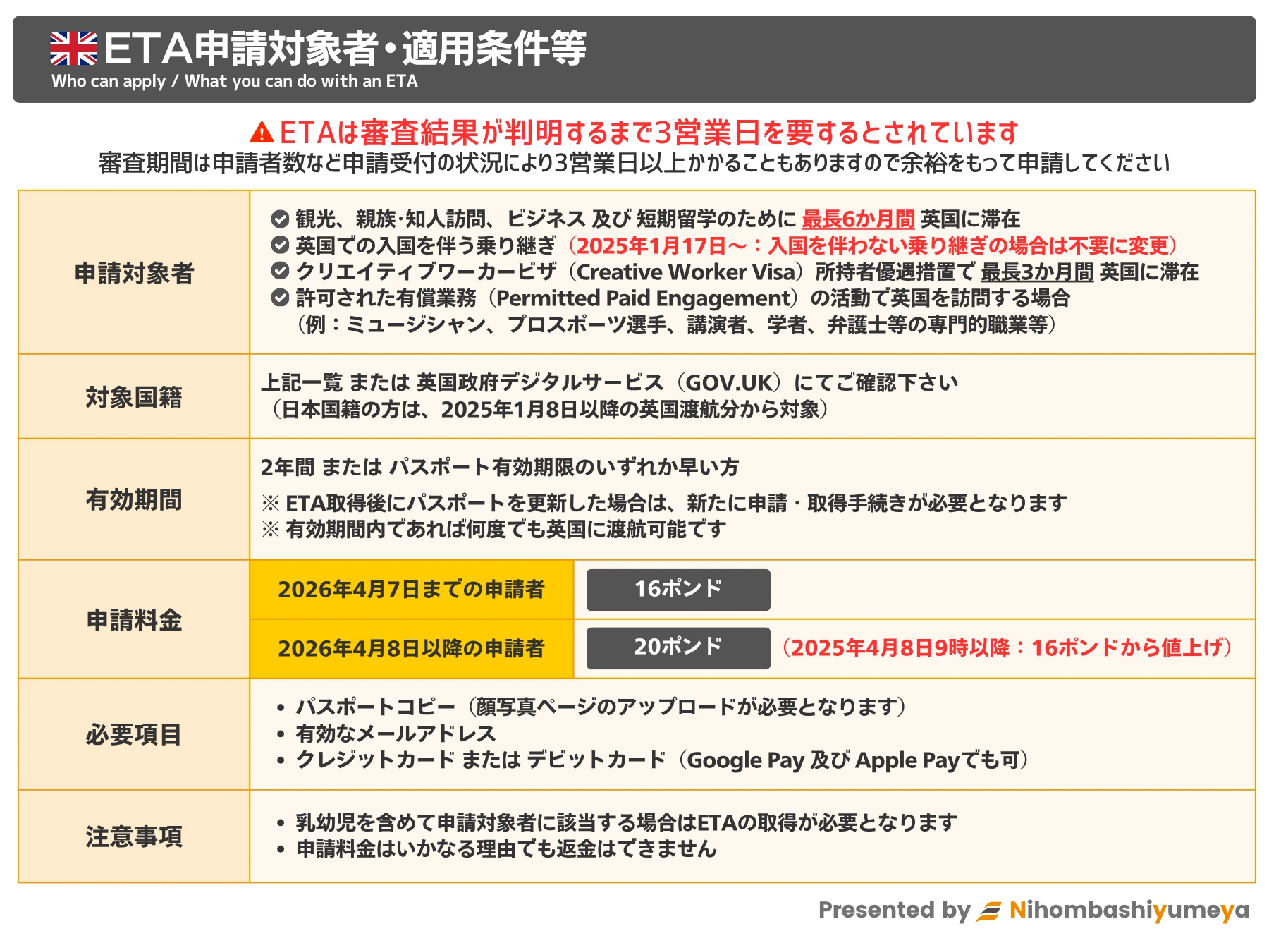 国籍や渡航目的・滞在日数等によりETAの対象が異なる場合がありますので、外国籍の方の場合は GOV.UK 等でご確認下さい。