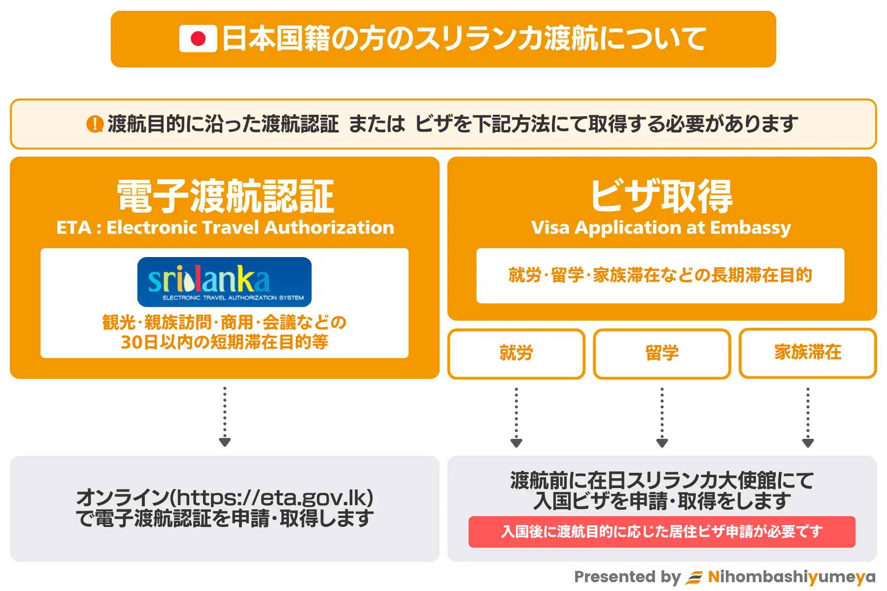 日本国籍の方がスリランカに渡航する場合、渡航目的に沿った電子渡航認証(ETA)または ビザ(査証)取得が必要となります。