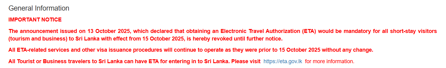 スリランカETAに関する告知の撤回について2025年10月15日より、スリランカへの全ての短期滞在訪問者(観光 及び ビジネス)に対して電子渡航認証(ETA)の取得を義務化する旨を宣言した2025年10月13日付けの告知は、追って通知があるまで撤回されます。