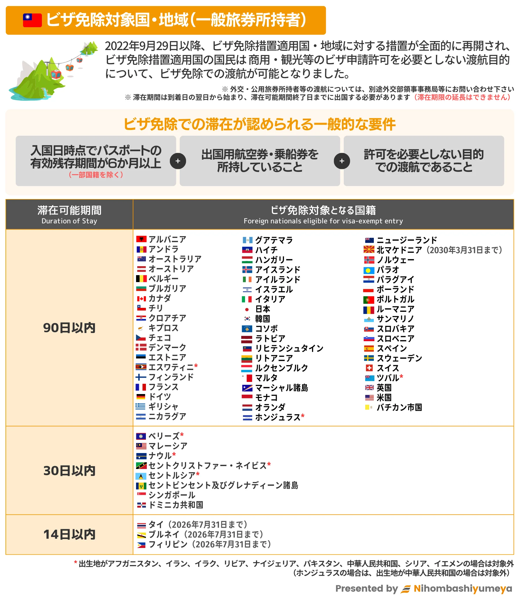 (下記対象国のビザ免除での滞在については別途条件が付随している場合がございます)