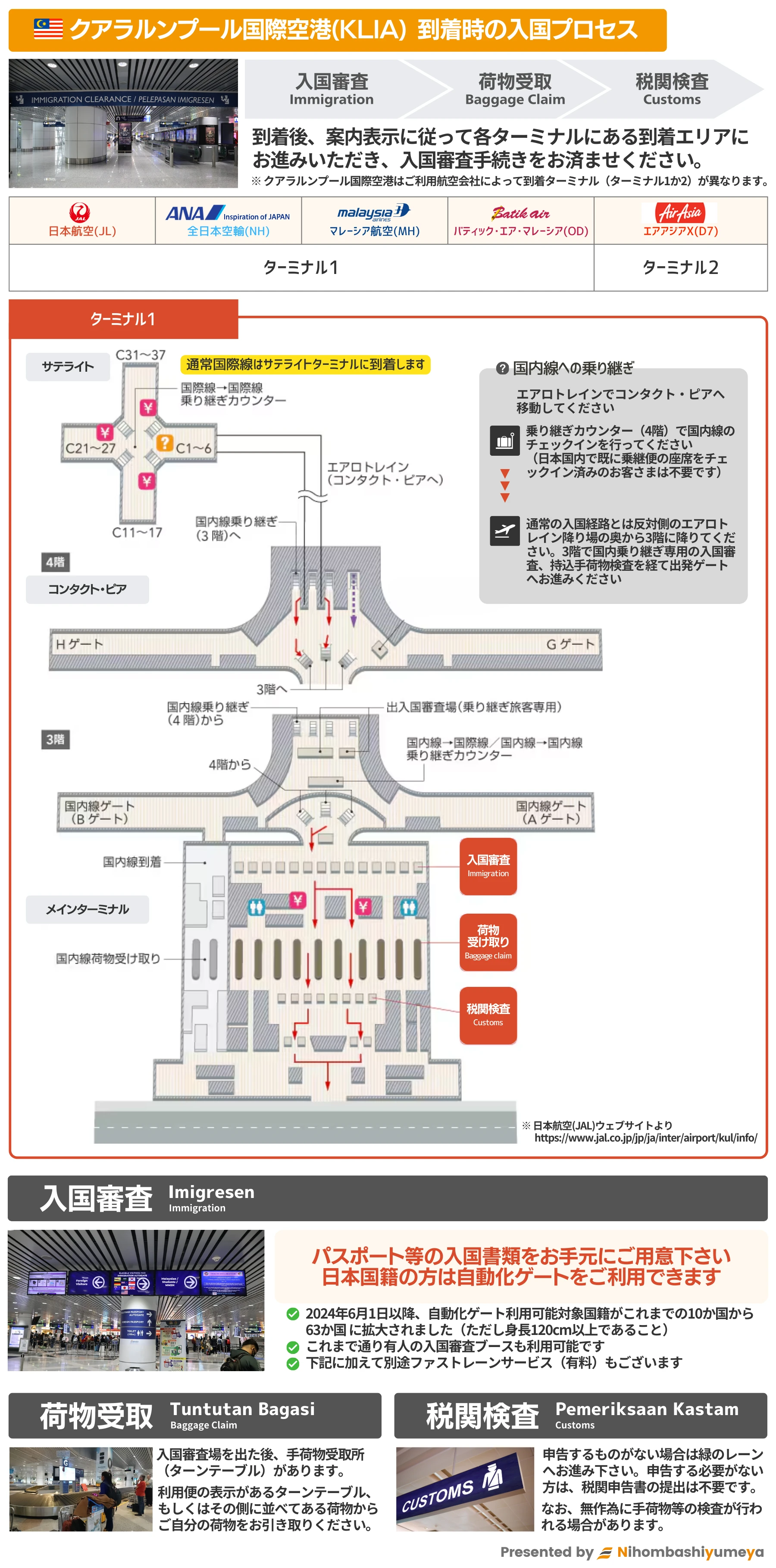 クアラルンプール国際空港(KLIA)に到着し、日本を含む63か国の国籍の方(120cm以上)は、入国審査時に 自動化ゲート(AutoGate)を利用可能です。