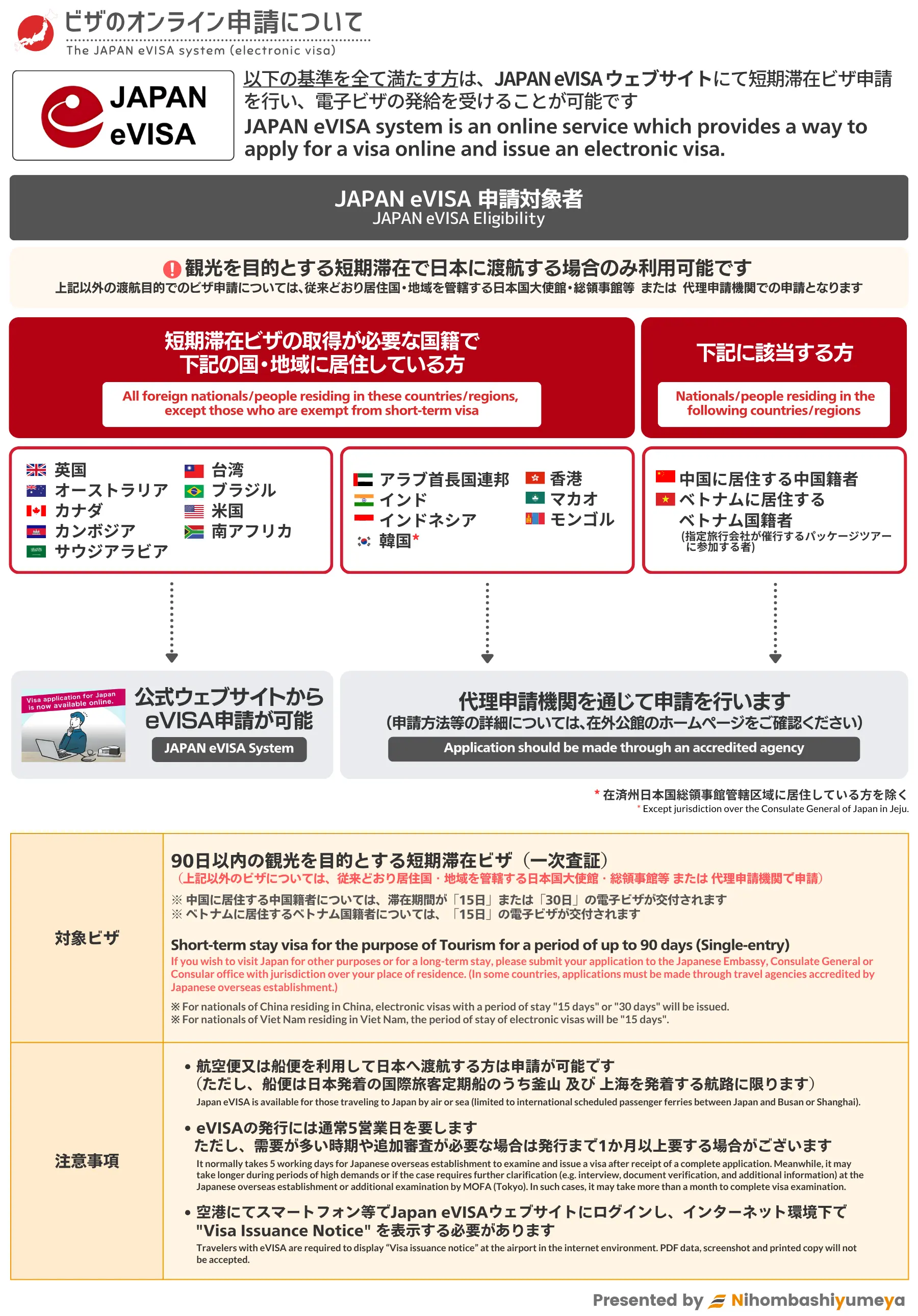 以下に該当する対象者は 観光を目的とする短期滞在ビザ を申請する場合、JAPAN eVISA ウェブサイト(英語)からオンライン申請を行い、電子ビザの発給を受けることができます。