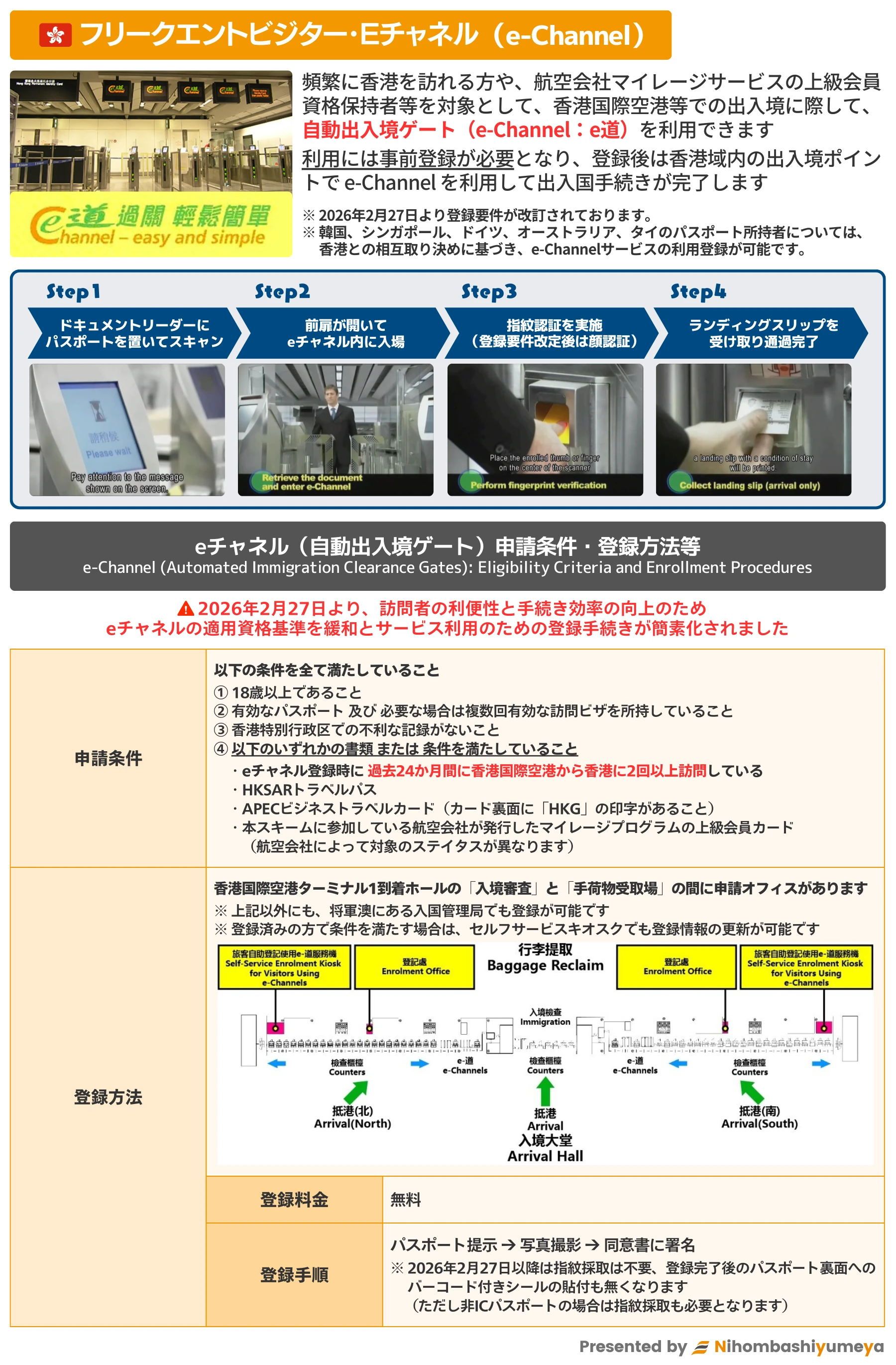 2026年2月27日より、eチャネルの登録資格基準の一部と手続き手順等が緩和されました旧)過去12か月以内に香港国際空港から3回以上入境していること