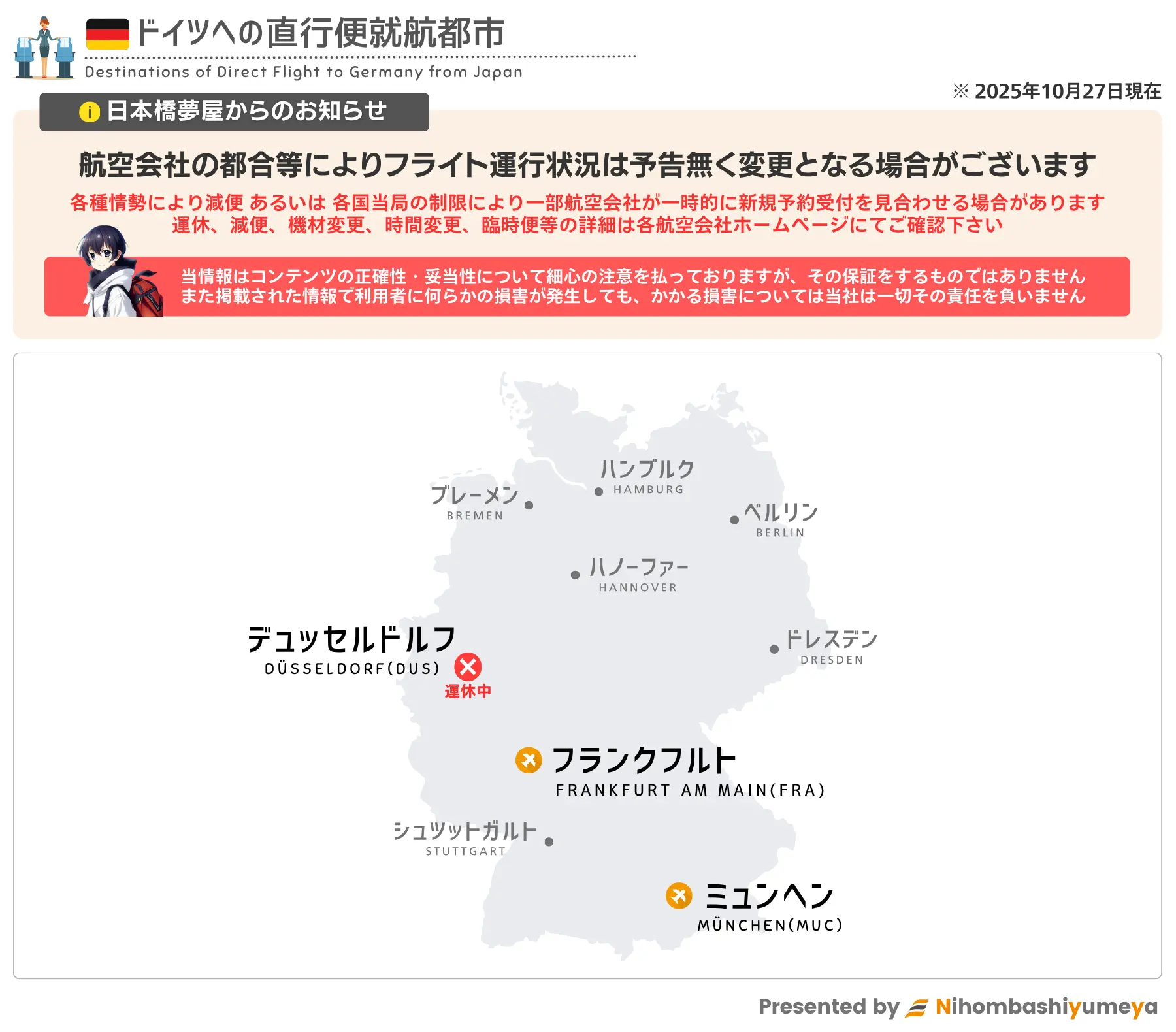 下記バナー(各航空会社の運行状況)より、日本-ドイツ間のフライト運行状況についてご案内しております。