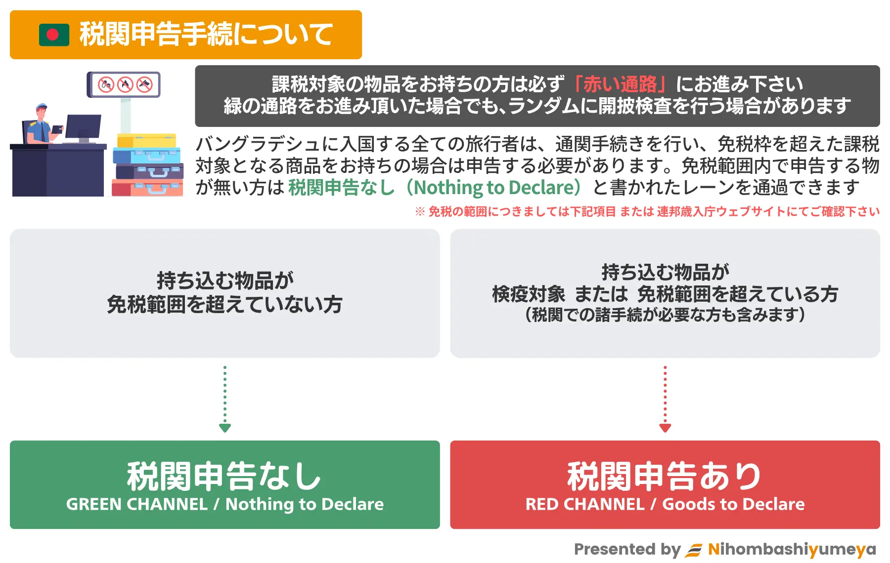 免税範囲を超過・検疫対象となる物品等をお持ちの場合は、税関検査場で 税関申告あり(Goods to Declare) と表示されたカウンターへお進み下さい。詳しくはバングラデシュ関税当局にお問い合わせ下さい。