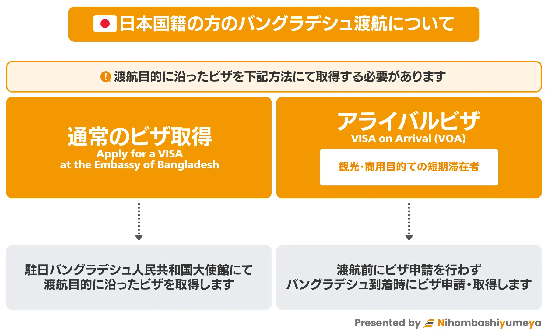 日本国籍の方がバングラデシュに渡航する場合、渡航目的に沿ったビザ 取得が必要となります。
