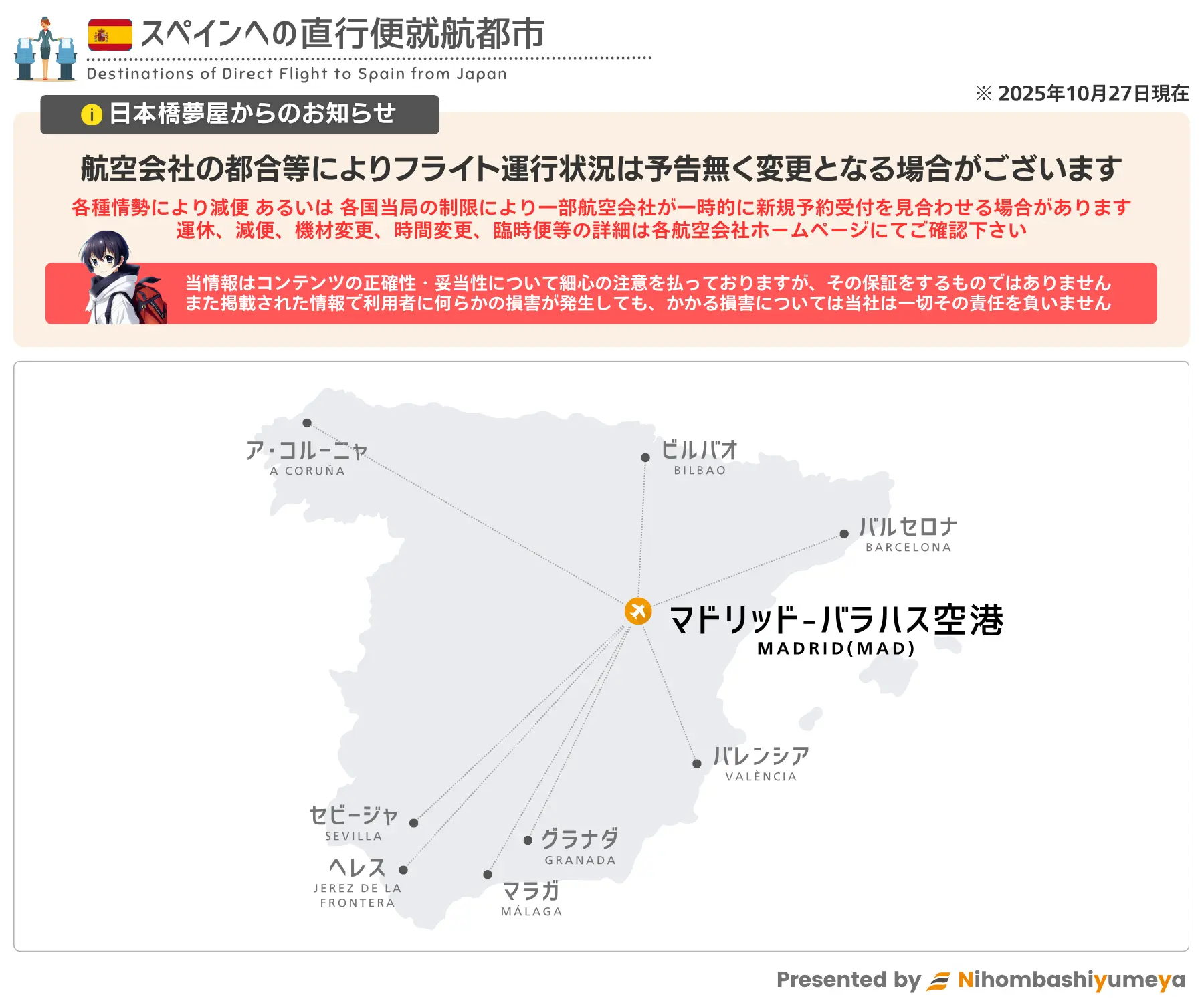 下記バナー(各航空会社の運行状況)より、日本-スペイン(マドリッド)間のフライト運行状況についてご案内しております。