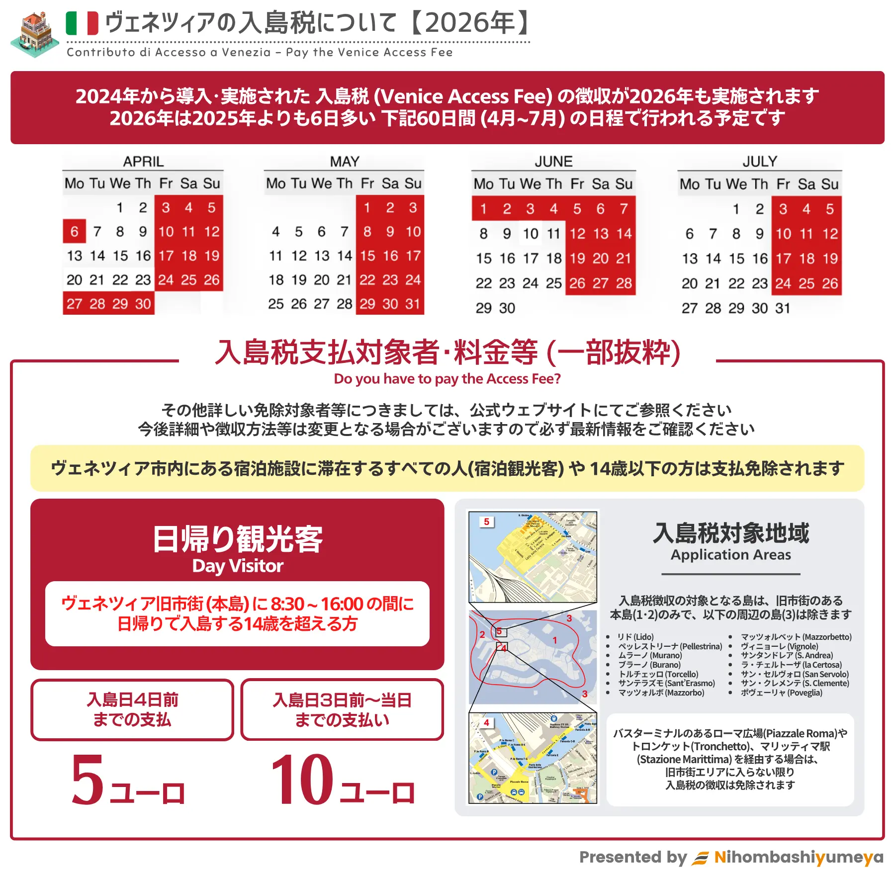 2026年は以下の60日間実施する予定で、8:30~16:00の間にヴェネツィア旧市街に日帰りで滞在する14歳を超える方が対象となります。