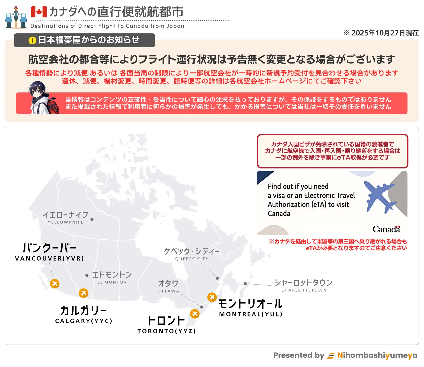 カナダ行きの航空機搭乗手続きの際に eTAが認証済み である必要があります。