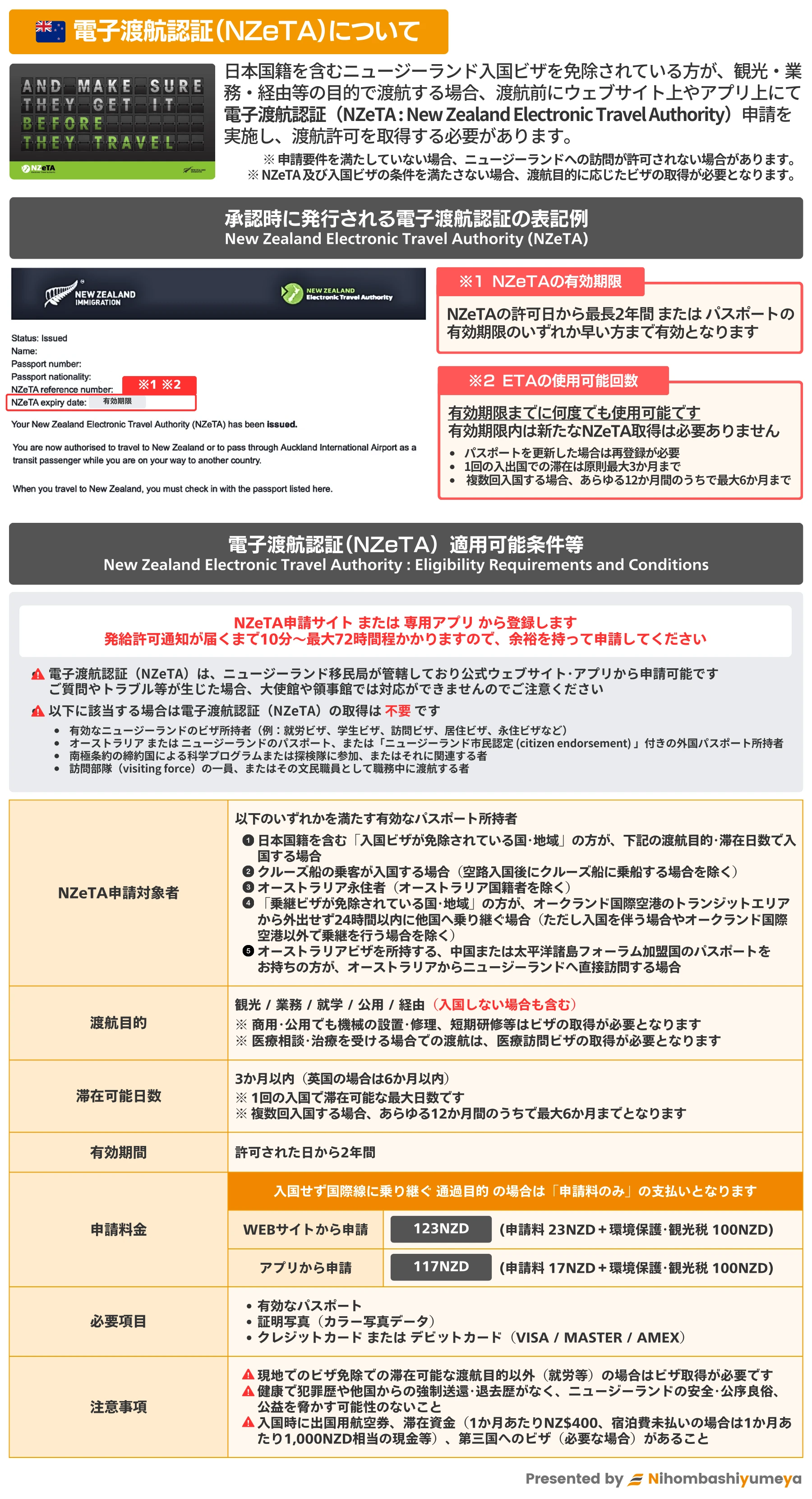 日本国籍の方が 3か月以内の観光・業務・経由(入国しない場合も含む)目的でニュージーランドへ渡航する場合は、ビザ取得が免除されますが、渡航前に 電子渡航認証(NZeTA)の申請・取得が必要です。