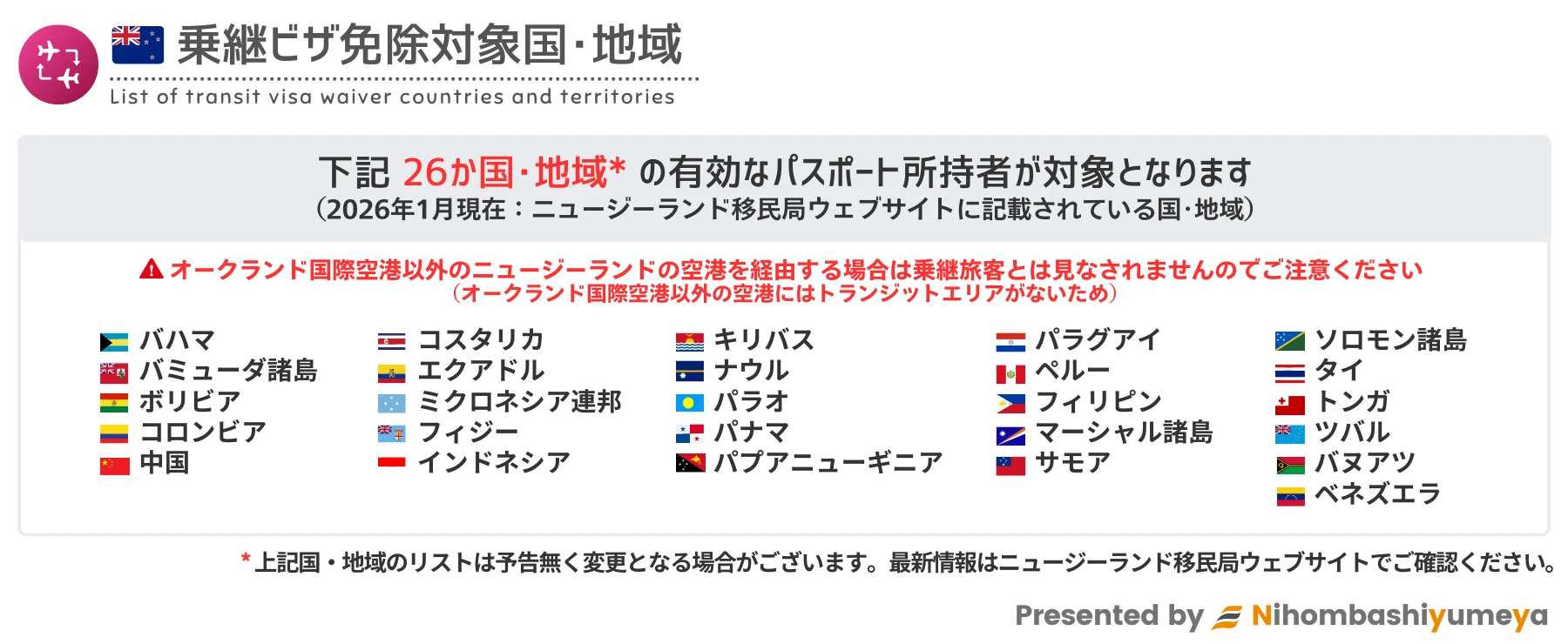 ※ ただしニュージーランド電子渡航認証(NZeTA)を取得する必要があります