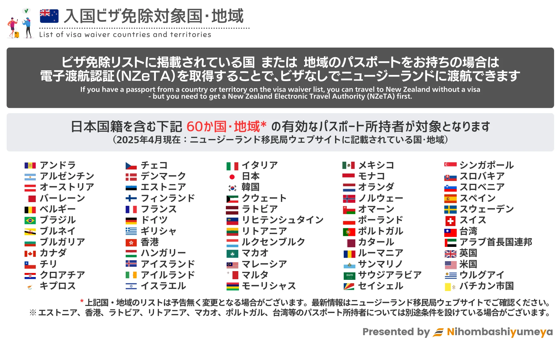 入国ビザ免除リストに掲載されている国 または 地域のパスポートをお持ちの場合は、ビザなしでニュージーランドに渡航できます。
