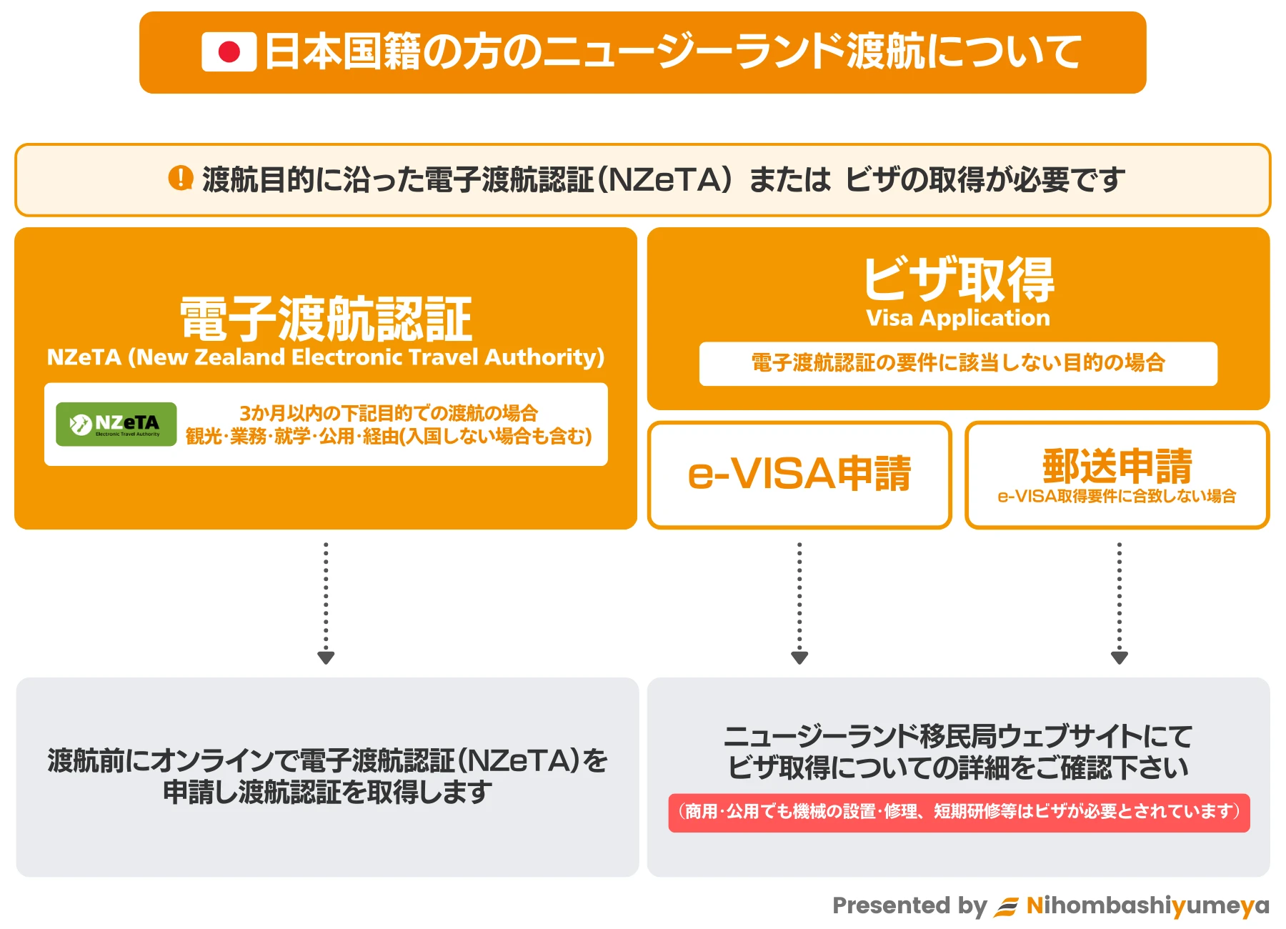 日本国籍の方のニュージーランド入国に際しては、電子渡航認証(NZeTA)または 渡航目的に沿ったビザ取得が必要 となります。