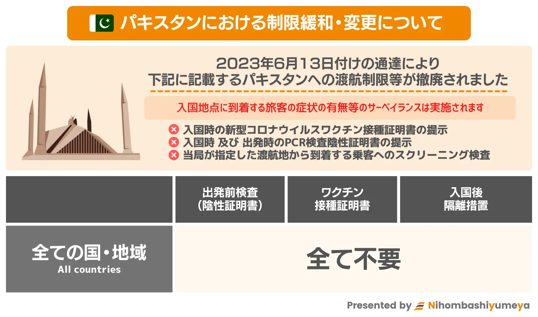 パキスタン連邦政府国家指揮運用センター(NCOC)は2023年6月13日付けで、新型コロナウイルスに関する水際対策を緩和し、ワクチン接種証明書の提示等が不要となりました。