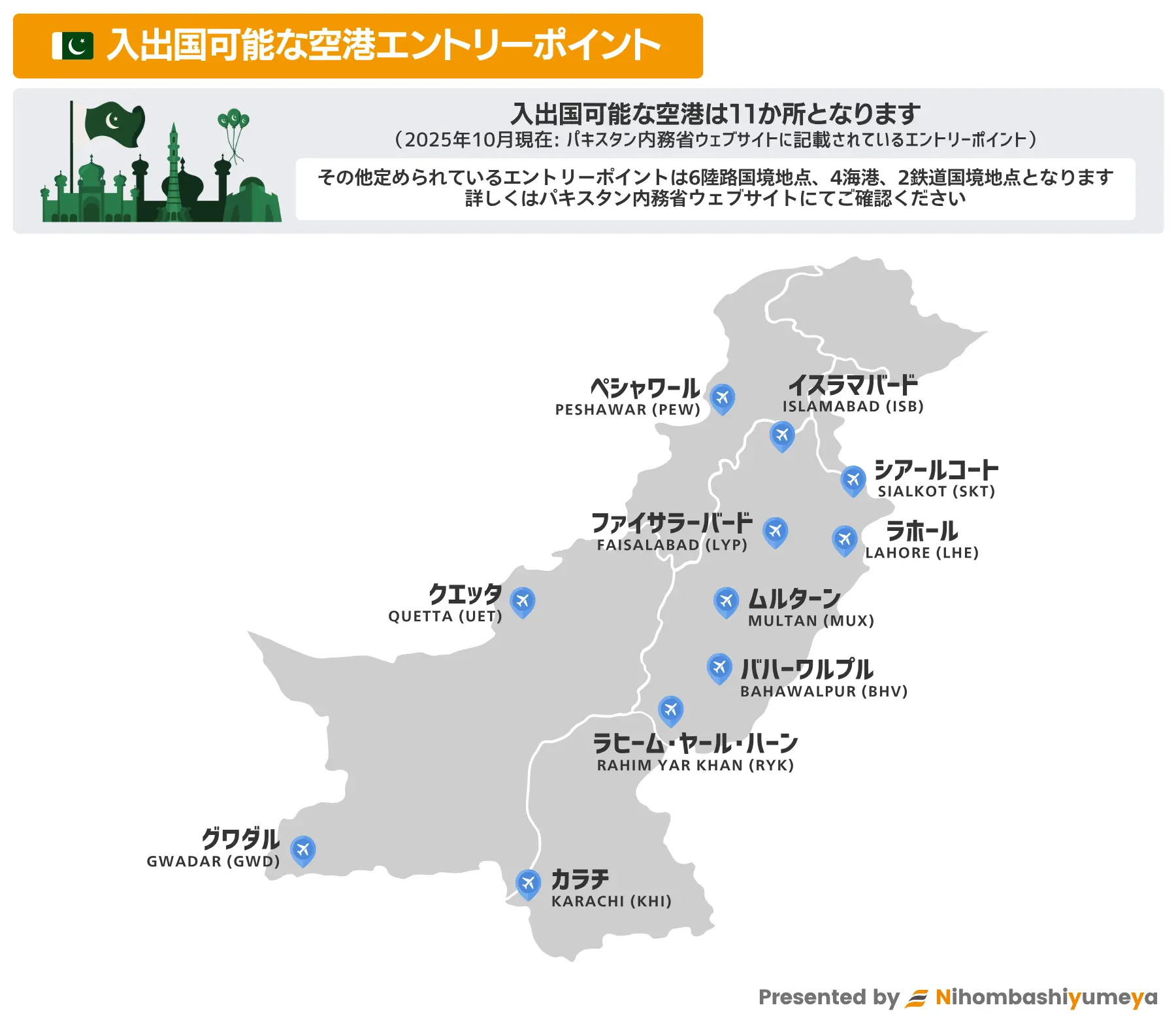 パキスタン内務省ウェブサイトに記載されている、入出国可能な空港は下記のとおりです。