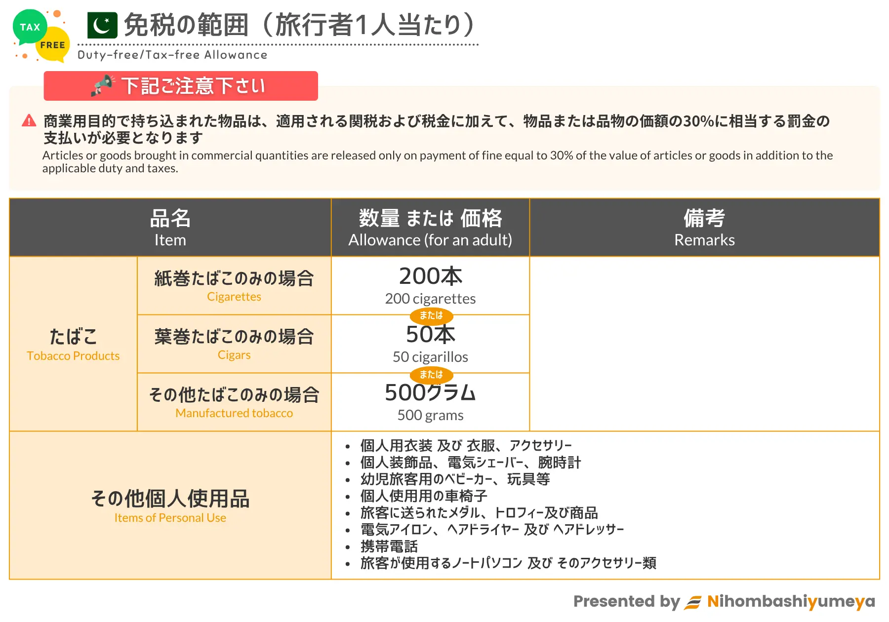パキスタン入国に際しての税関・動植物検疫の注意事項