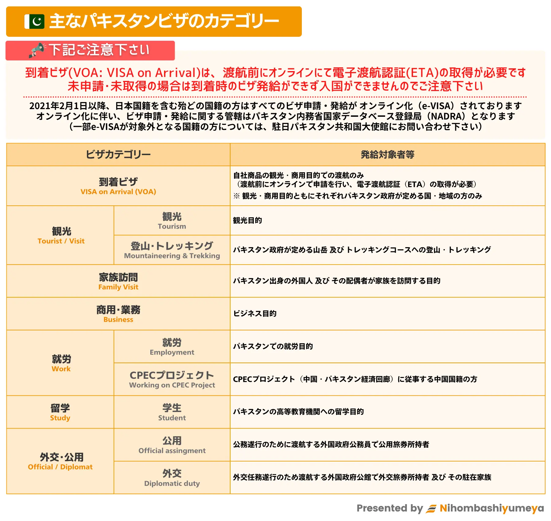 なお日本国籍以外の方のビザ要否等につきましては、パキスタン内務省 e-VISAポータルサイト 等にてご確認ください。