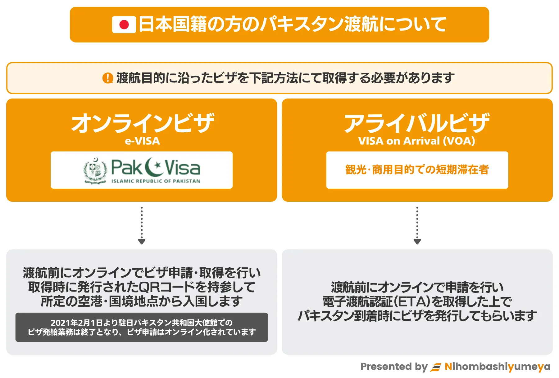 日本国籍の方がパキスタンに渡航する場合、渡航目的に沿ったビザ 取得が必要となります。