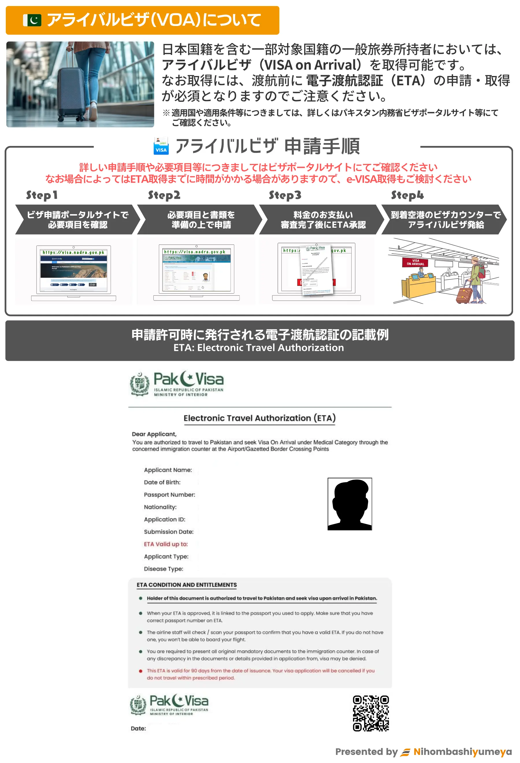 パキスタンに渡航し、現地空港の到着ビザカウンターでパキスタン到着ビザを申請することを許可するものです