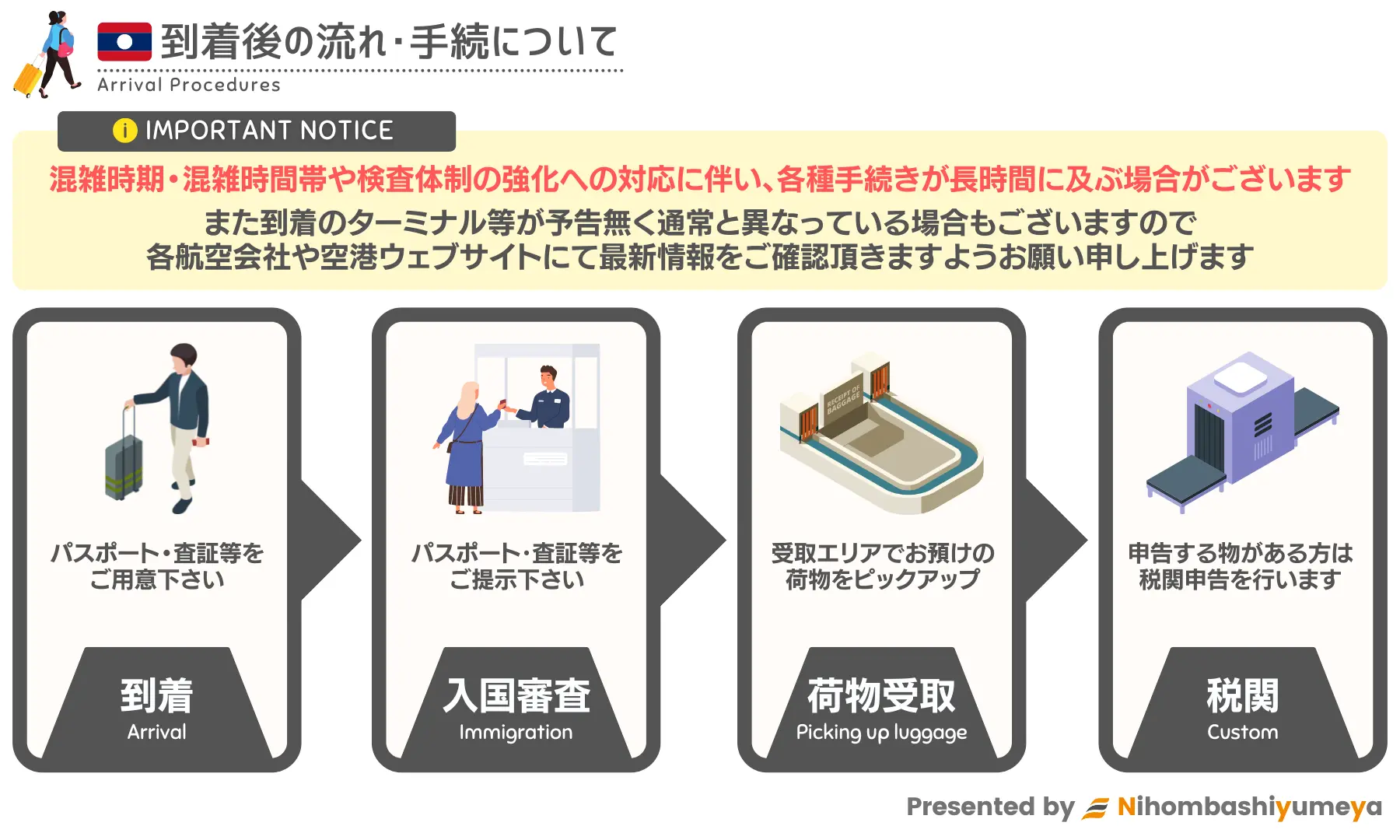 持ち込み・持ち出しが禁止されている品目は、麻薬、銃器、爆発物、仏像、古美術品、性的描写を内容とする映画フィルム・ビデオ・刊行物、模造品、電子タバコ、水タバコ、その他ラオス国内法で規制されるものとされています。