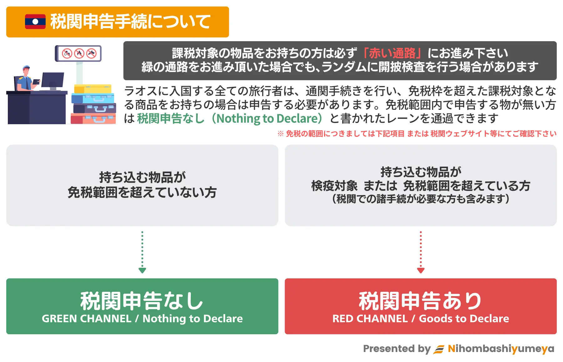 免税範囲を超過・検疫対象となる物品等をお持ちの場合は、税関検査場で 税関申告あり(Goods to Declare) と表示されたカウンターへお進み下さい。詳しくはラオス税関当局等にお問い合わせ下さい。