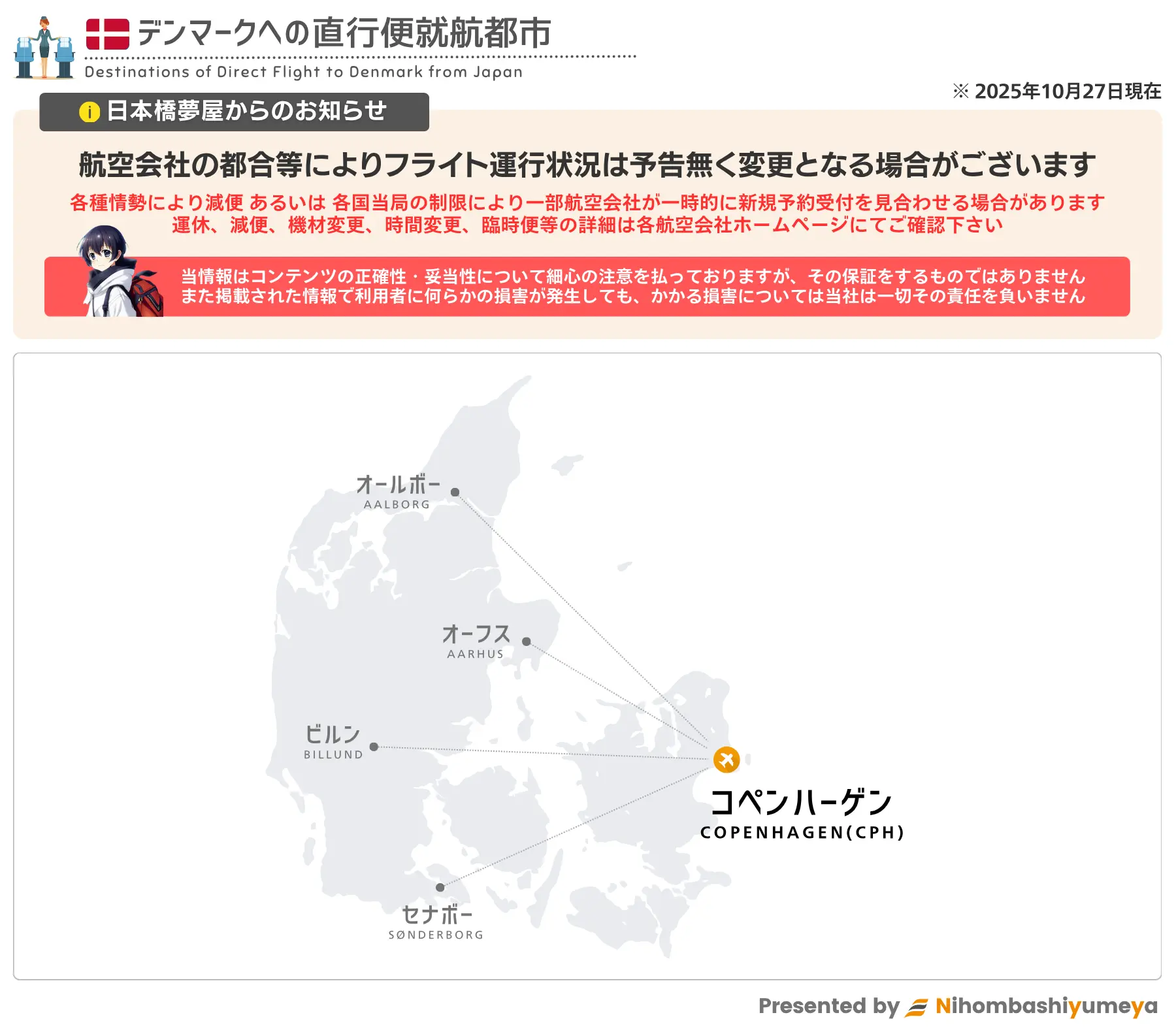 下記バナー(各航空会社の運行状況)より、日本-デンマーク(コペンハーゲン)間のフライト運行状況についてご案内しております。
