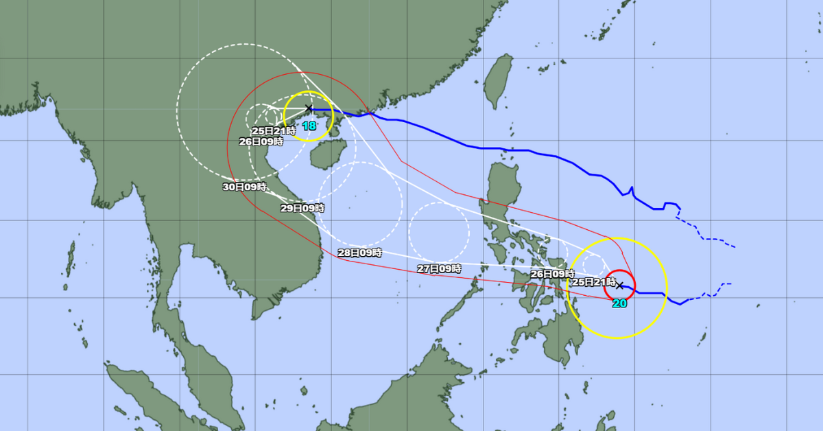 24日(水)の夜に中国華南に上陸後、急速に勢力が衰弱しています。25日(木)夜にはベトナム付近で熱帯低気圧に変わる予想です。随時、最新の情報をご確認ください。