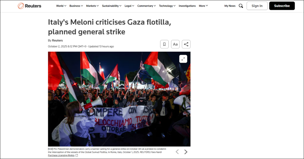 報道等によれば、10月2日夜から3日にかけては全国鉄道ストライキ、10月3日は全国ゼネスト、10月4日はローマで大規模な親パレスチナデモが予定されており、各都市において抗議活動が実施される見込みです。