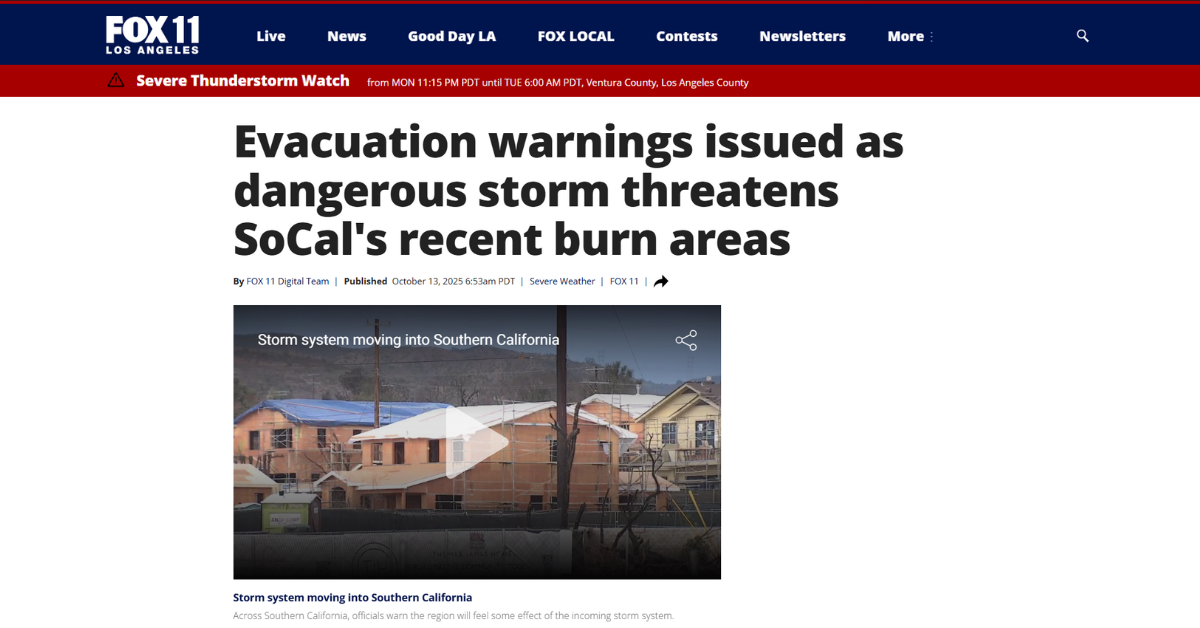 また、特に、今年のパリセーズ火災や昨年のエアポート火災(オレンジ郡)などの山火事の被災地域の一部では、土砂崩れ等の危険性が高いとして避難警報が発出されています。