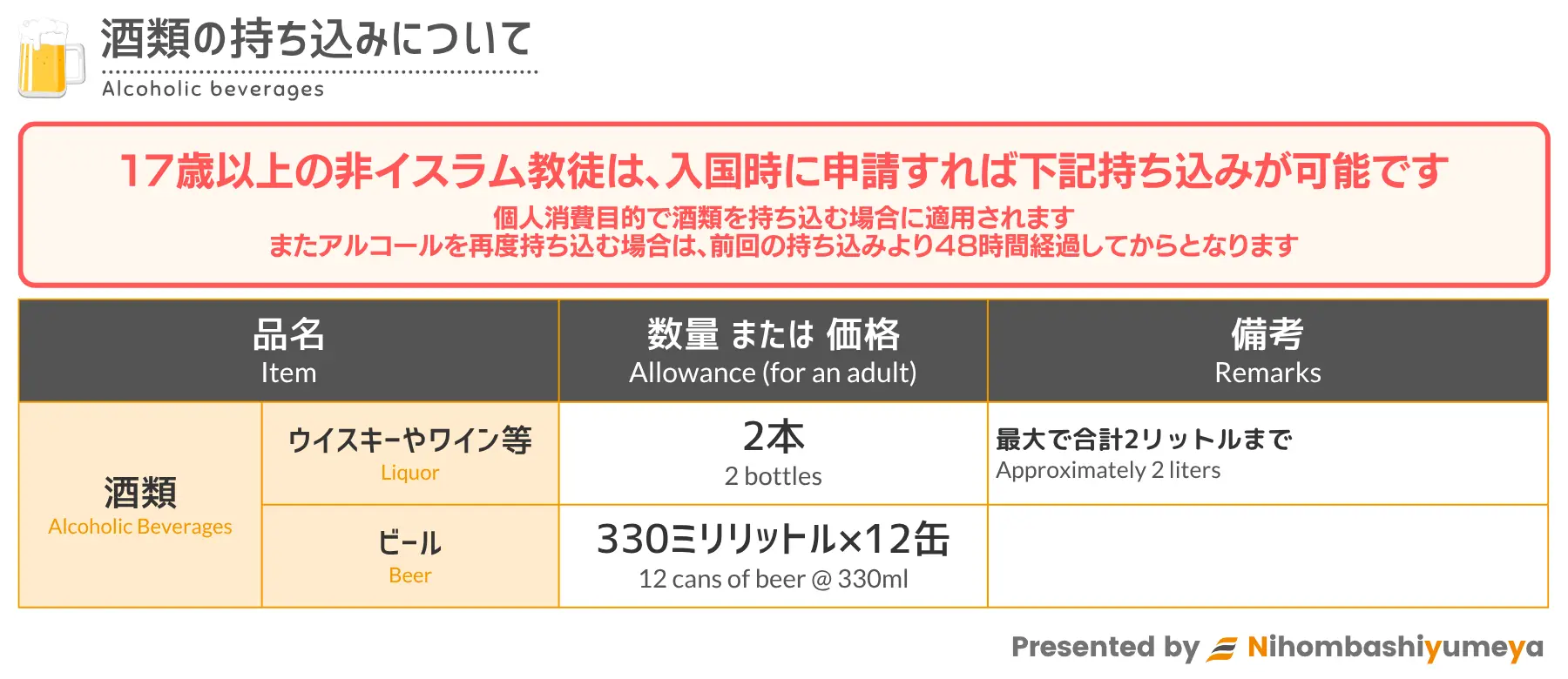 17歳以上の非イスラム教徒は規定された量の酒類の持ち込みが認められますが、入国時に申告が必要です(ウイスキーやワイン等ボトル2本(最大計2リットル)及び ビール330ml缶を12缶まで)