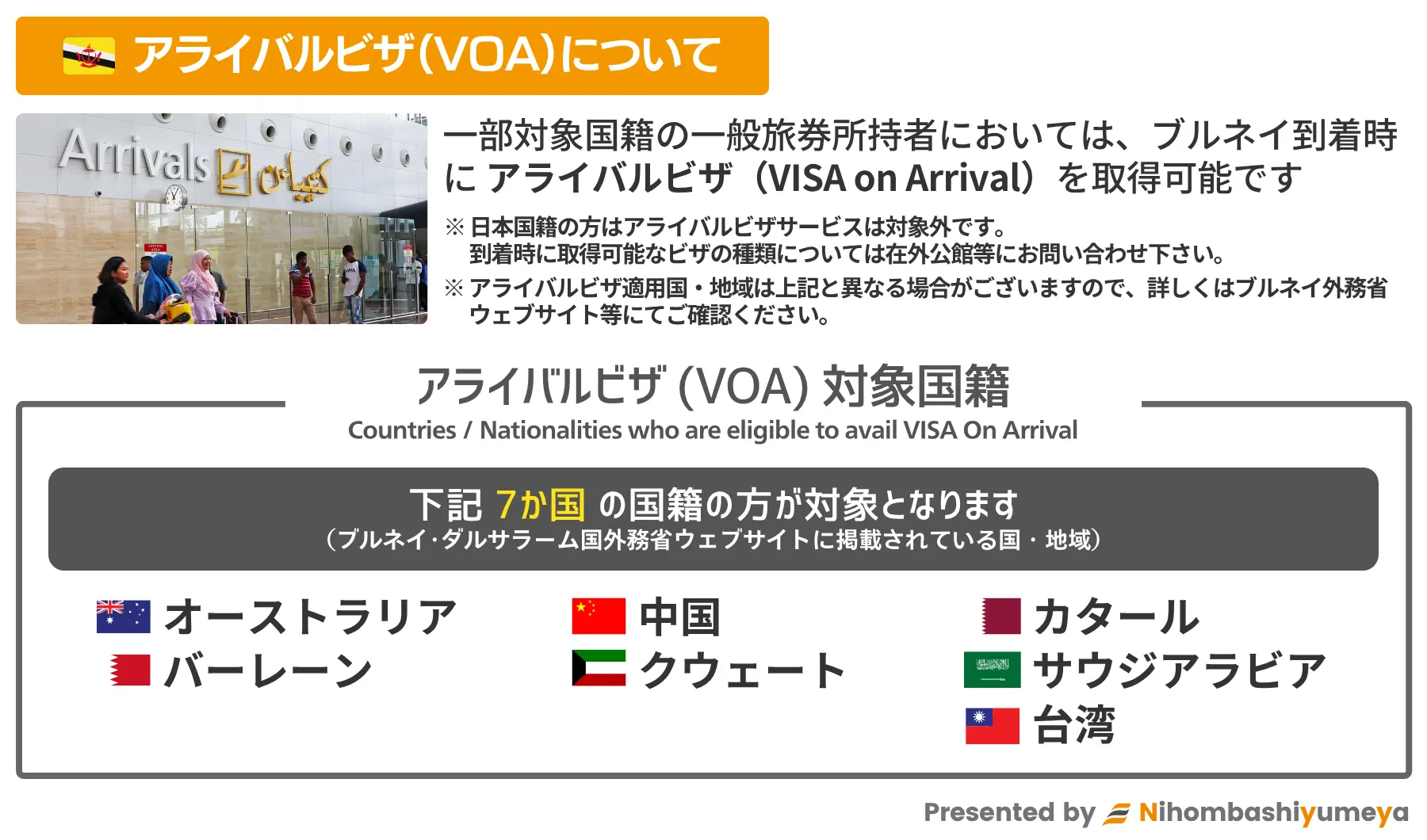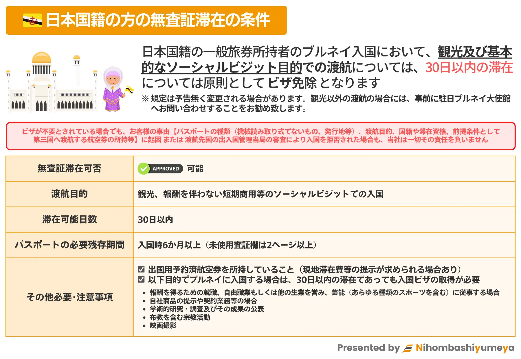日本国籍以外の方のビザ免除対象国等につきましては、ブルネイ・ダルサラーム国外務省ウェブサイト等にてご確認下さい。