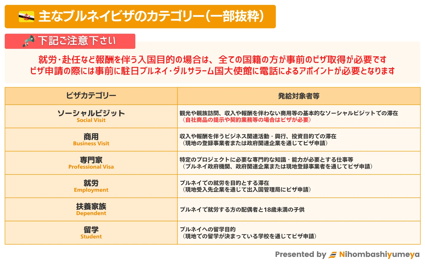 30日を超える滞在や、就労や報酬を伴う興行目的、留学目的の場合は、事前に許可を取得した上で、駐日ブルネイ・ダルサラーム国大使館において目的のビザ申請・取得が必要となります。