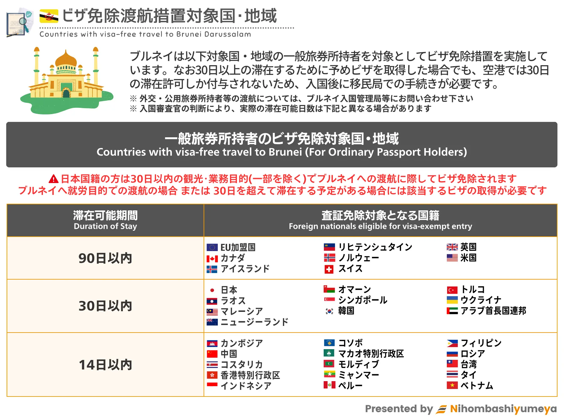 ブルネイは以下対象国・地域の一般旅券所持者を対象としてビザ免除措置を実施しています。