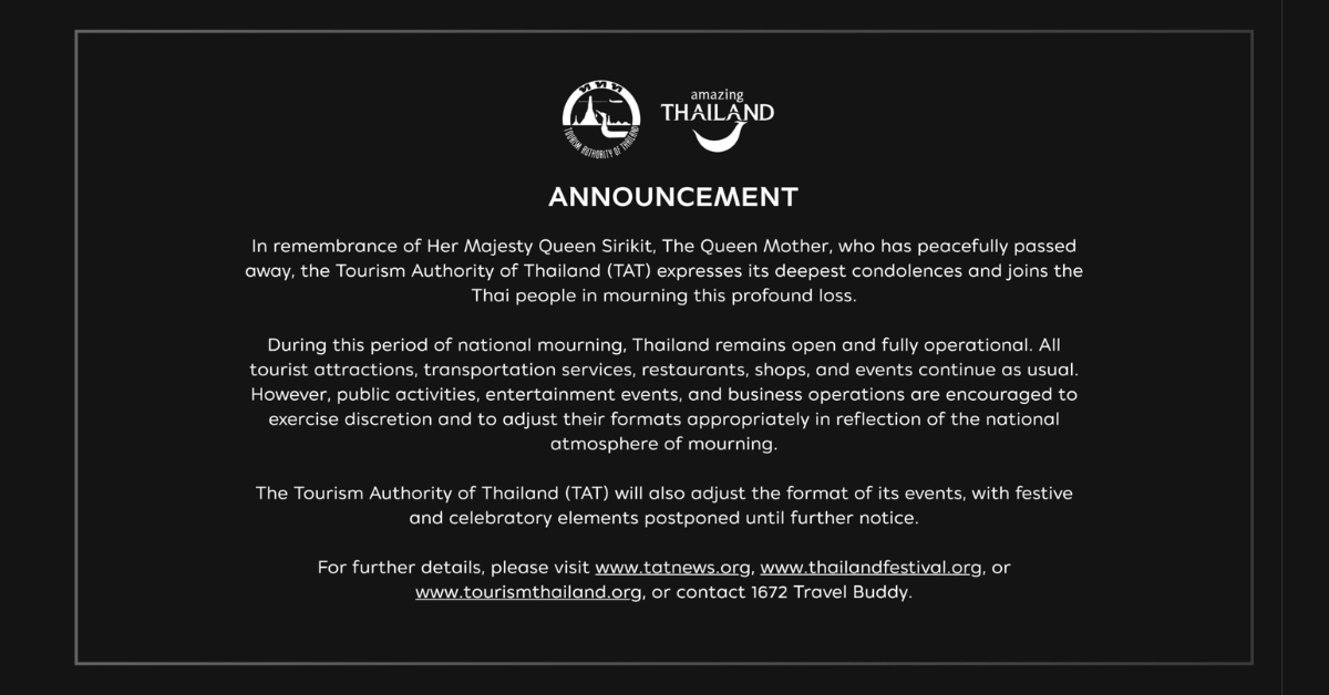 タイ王国政府は、シリキット王太后陛下の崩御を受けて、陛下の生涯にわたるタイ国家とタイ国民への献身と貢献に敬意を表し、国家喪に服すことを発表しました。 政府は、公務員および国民に対する服喪のガイドラインを概説する一方で、日常生活と観光は通常どおり継続することを確認し、服装と行動における敬意を強調しています。