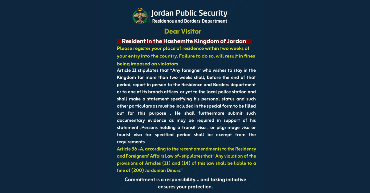 1 ヨルダンでは2025年2月に「外国人居住に関する法」改正が可決され、このたび、二週間以上ヨルダンに滞在する全ての外国人に対して、入国日から二週間以内に最寄りの警察署に滞在場所を届け出ることが義務づけられました。違反した場合、200ヨルダン・ディナールの罰金が科せられる可能性があります。