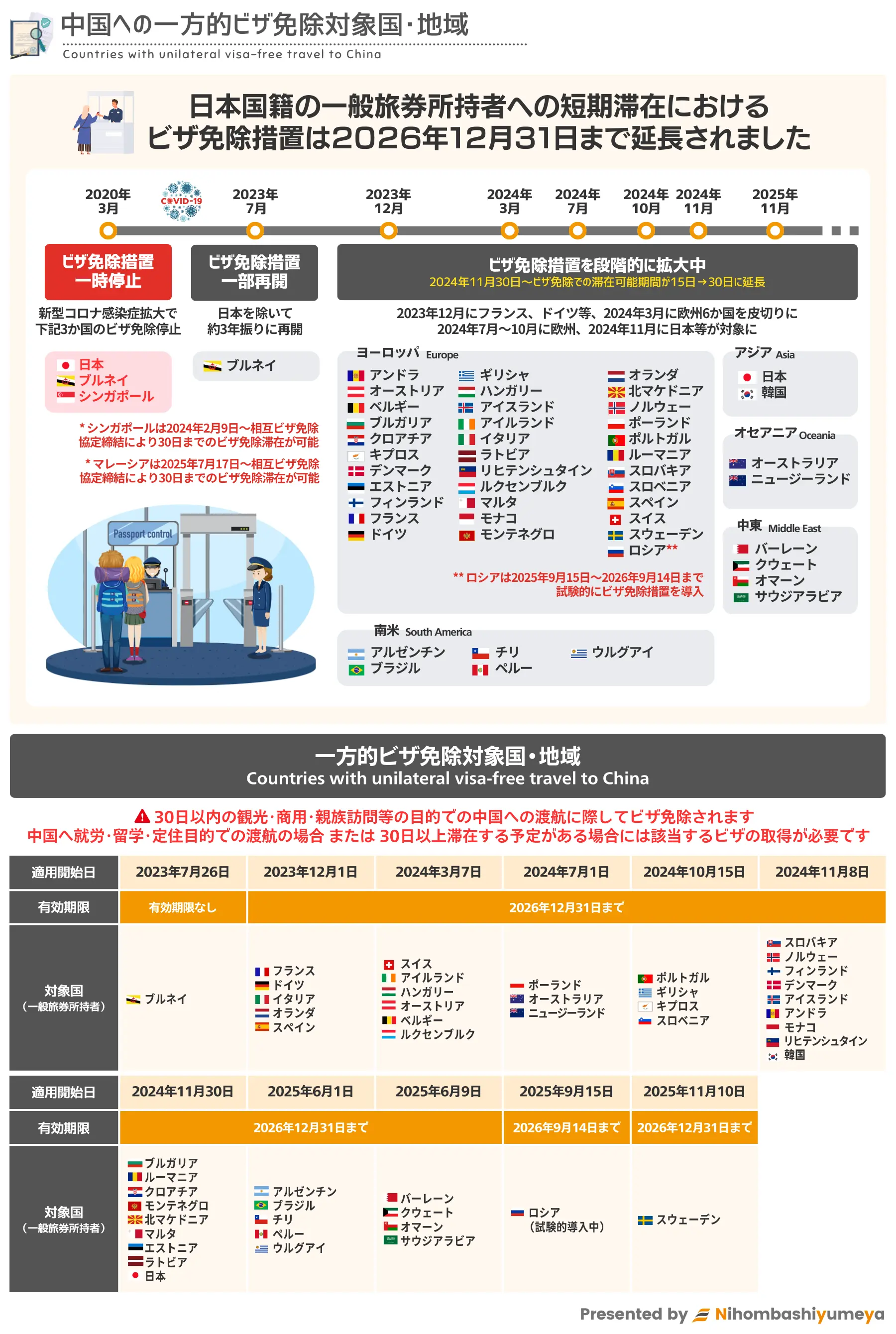 中国は、日本を含む複数の国の国民に対する30日間の一方的ビザ免除入国措置を1年間延長することを発表しました。これにより、当初2025年末に期限を迎える予定だったこの措置は2026年12月31日まで継続されます。