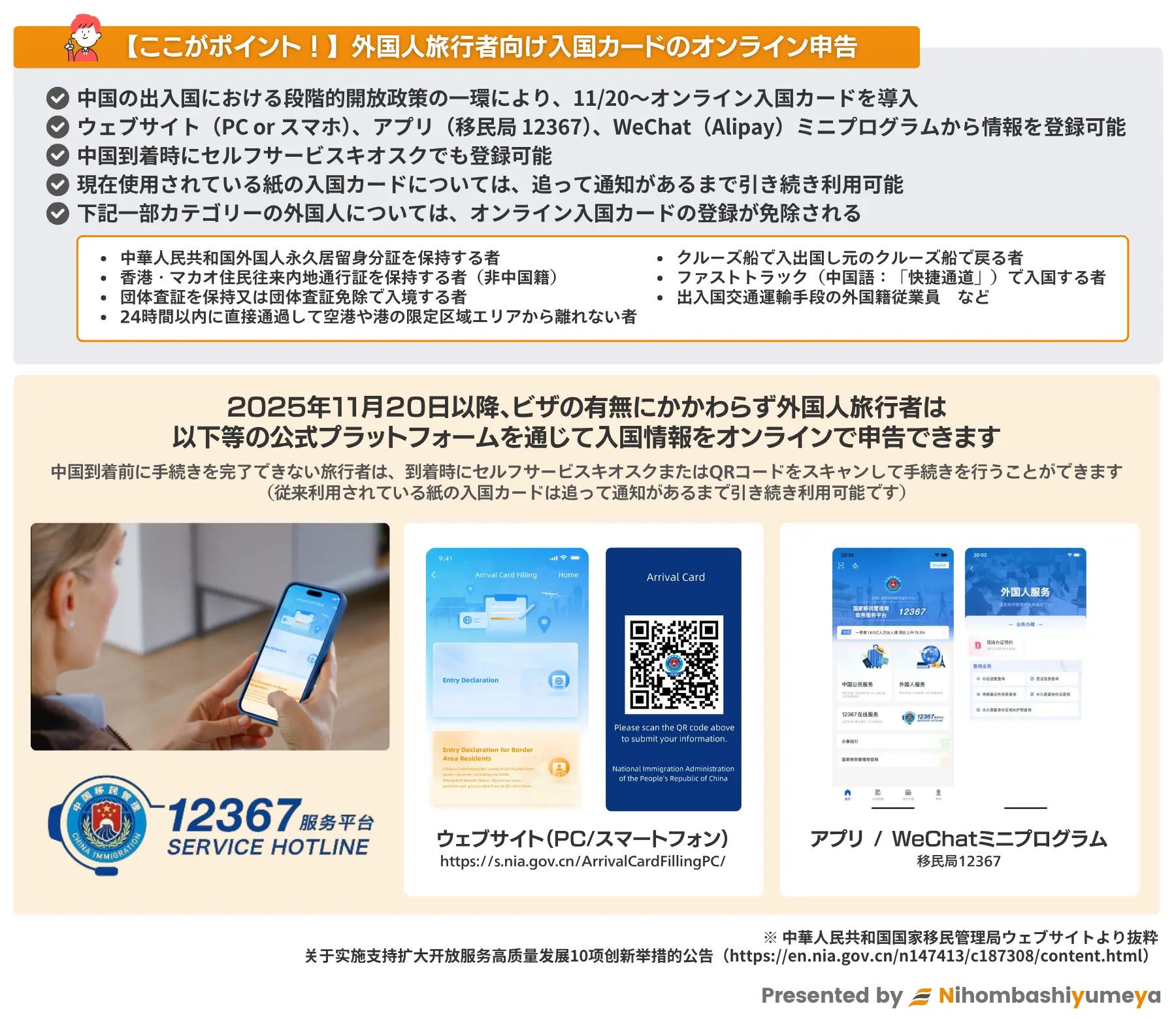 2025年11月3日に国家移民管理局(NIA)は、「開放拡大及びサービスの高品質な発展を支援するための10項目の革新措置実施に関する公告」を発出しました。この中で、本年2025年11月20日から、外国人が入国する際に、入国カードのオンライン申告が可能になりました(登録方法はこちら)。