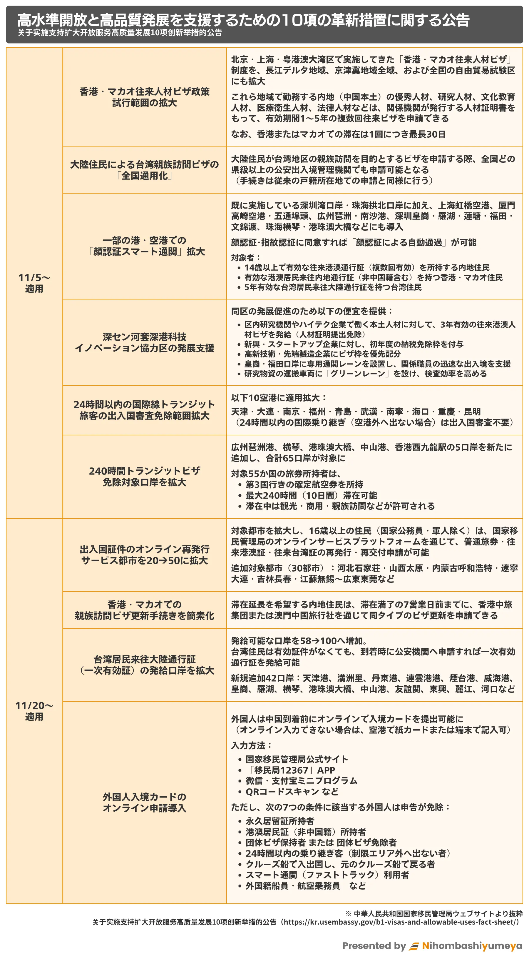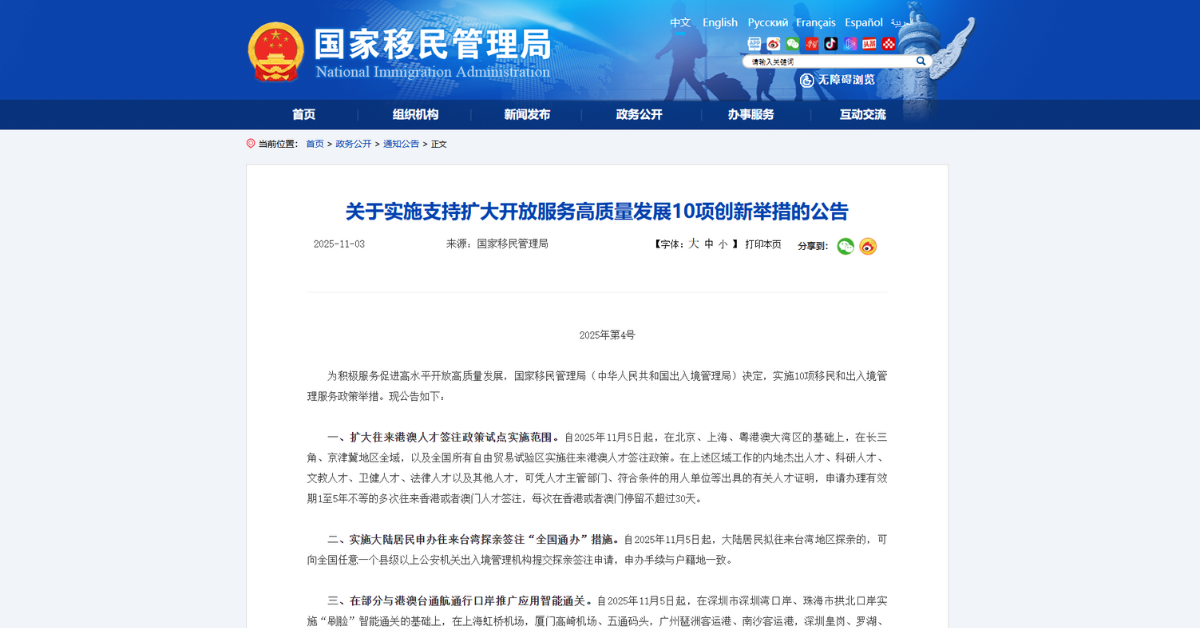 2025年11月3日に国家移民管理局(NIA)は、「開放拡大及びサービスの高品質な発展を支援するための10項目の革新措置実施に関する公告」を発出しました。この中で、本年2025年11月20日から、外国人が入国する際に、入国カードのオンライン申告が可能になる旨も発表されています。