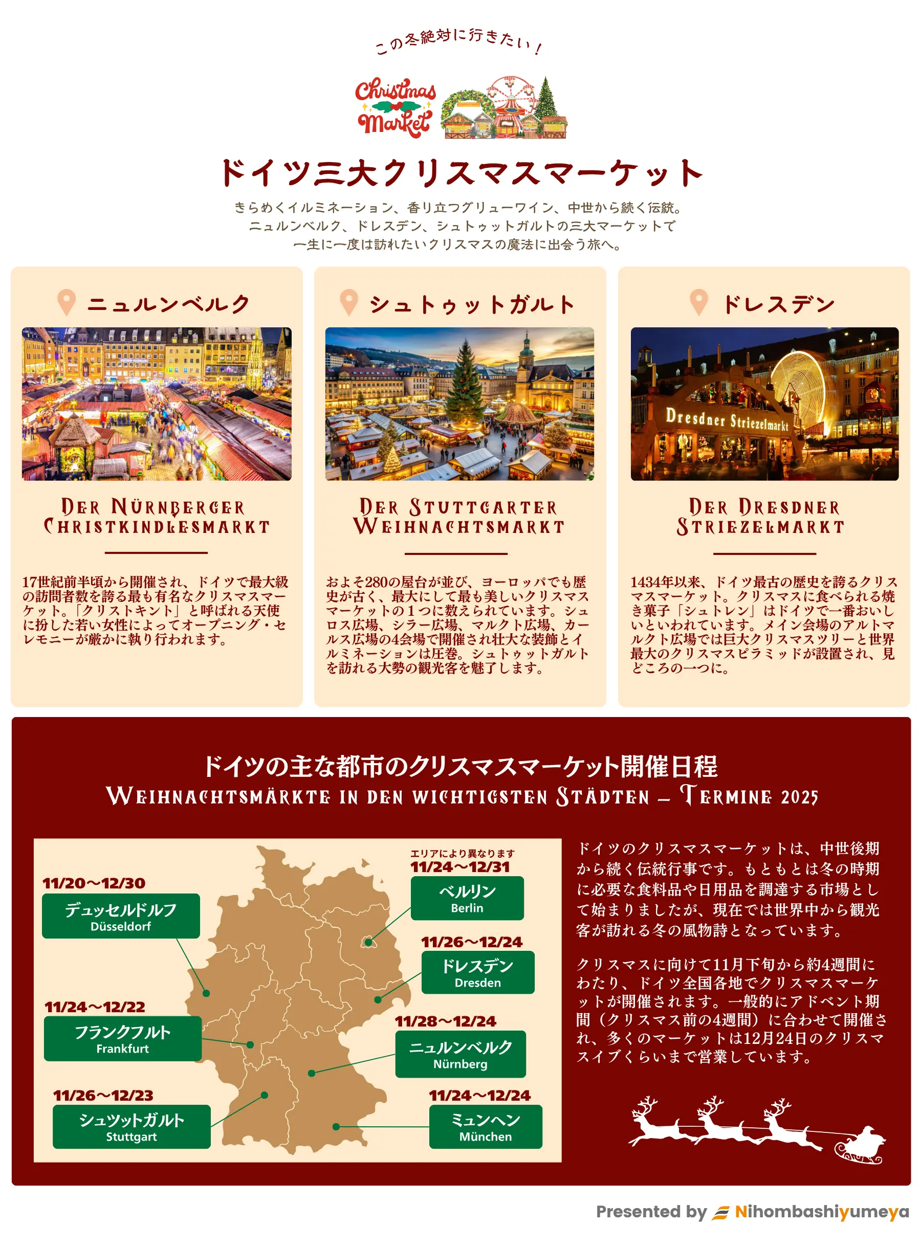 11月下旬からドイツ国内各地においてクリスマス・マーケットが開催されます。