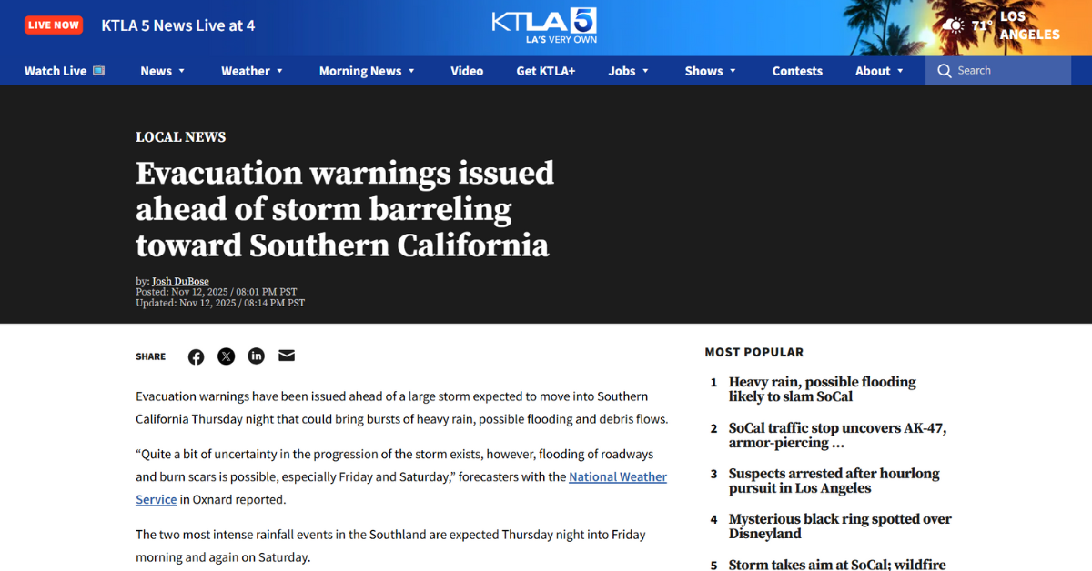 NWS(米国立気象局)によると、南カリフォルニアにおいて、11月14日(金)から週末にかけて、嵐の影響を受ける地域が広範囲に及ぶと予報し、洪水等の注意報が出されているエリアもあります。