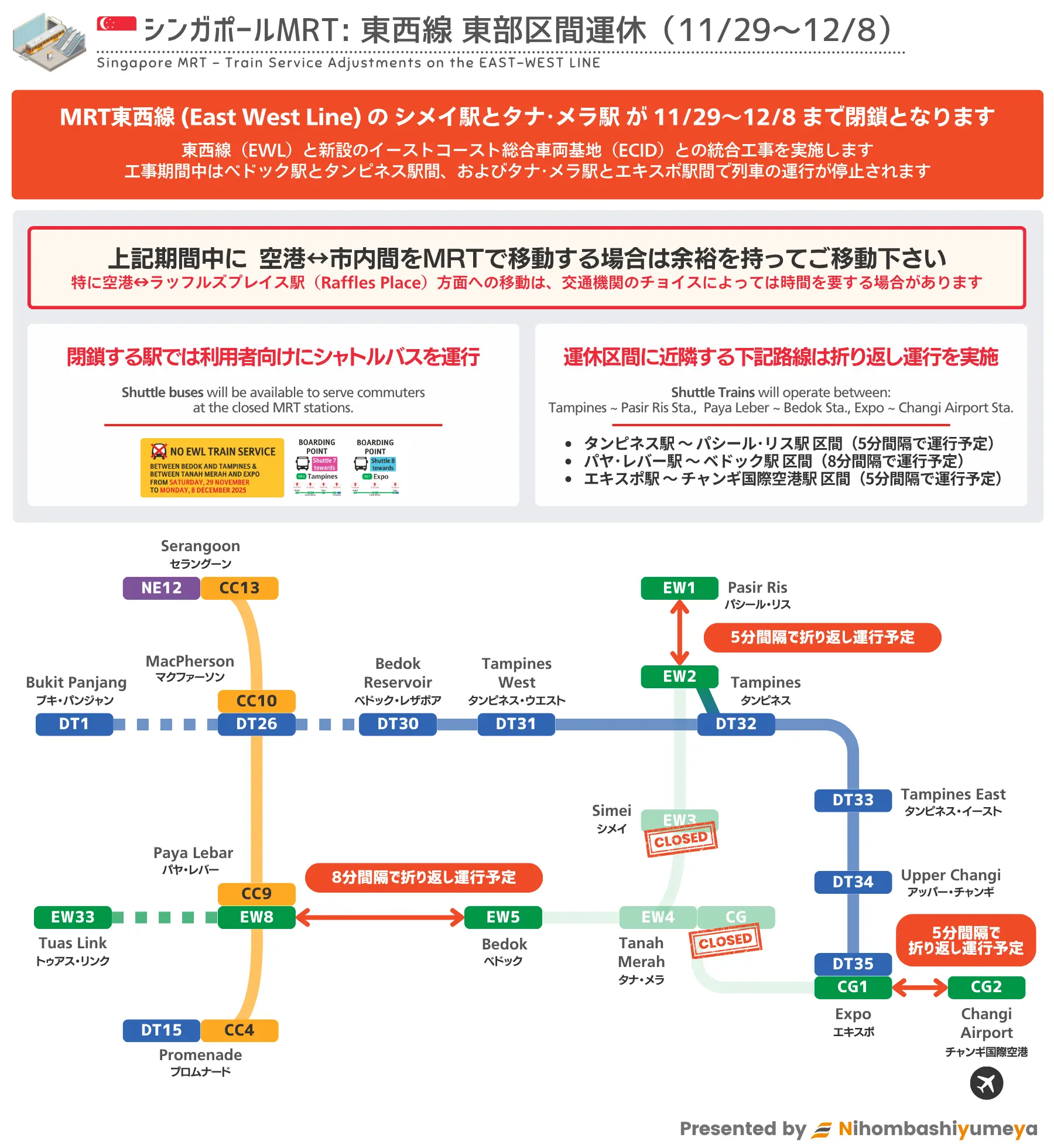 シンガポールMRT東西線(EWL)と新設のイーストコースト総合車両基地(ECID)との統合工事実施により、2025年11月29日〜12月8日の期間中、シメイ駅とタナ・メラ駅は終日閉鎖され、MRT東西線の一部は運休、閉鎖駅の隣接区間については代替シャトル列車・バスが運行されます。