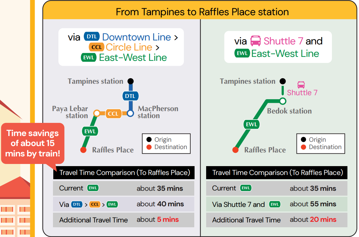 タンピネス駅からシャトルバスを利用してベドック駅→ラッフルズプレイス駅を利用する場合、通常よりも20分程追加時間がかかる見込みですが、ダウンタウン線を利用すれば追加時間は5分程と見込まれています。