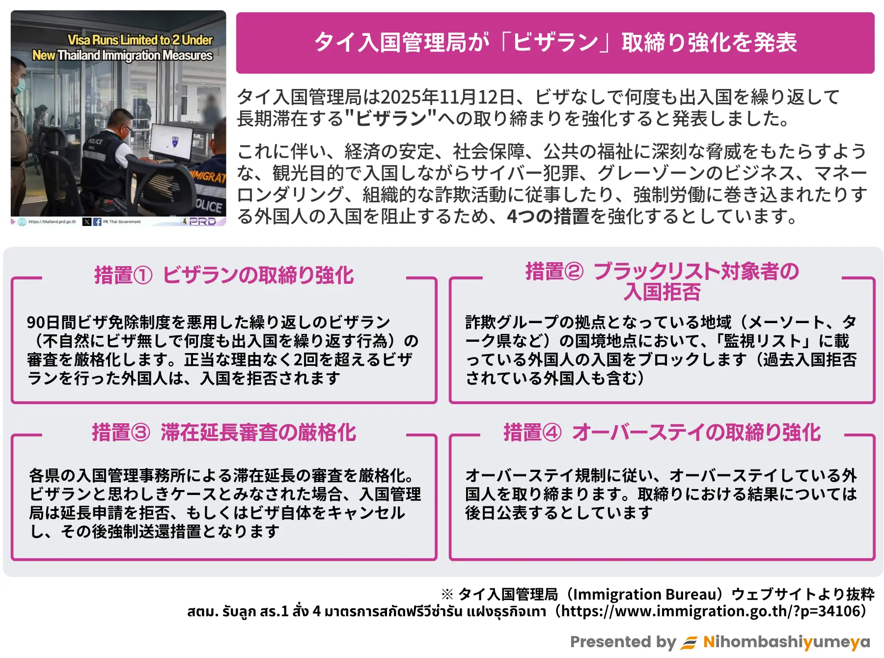 タイ入国管理局は2025年11月12日、ビザなしで何度も出入国を繰り返して長期滞在する"ビザラン"への取り締まりを強化すると発表しました。