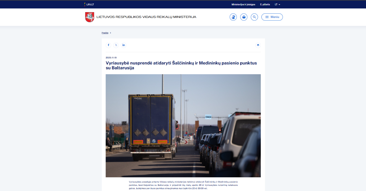 2025年11月19日、リトアニア政府は、ベラルーシとの陸路国境であるメディニンカイ国境検問所の通過制限 及び シャルチニンカイ国境検問所の無期限業務停止を11月20日午前0時から解除する決定をしました。