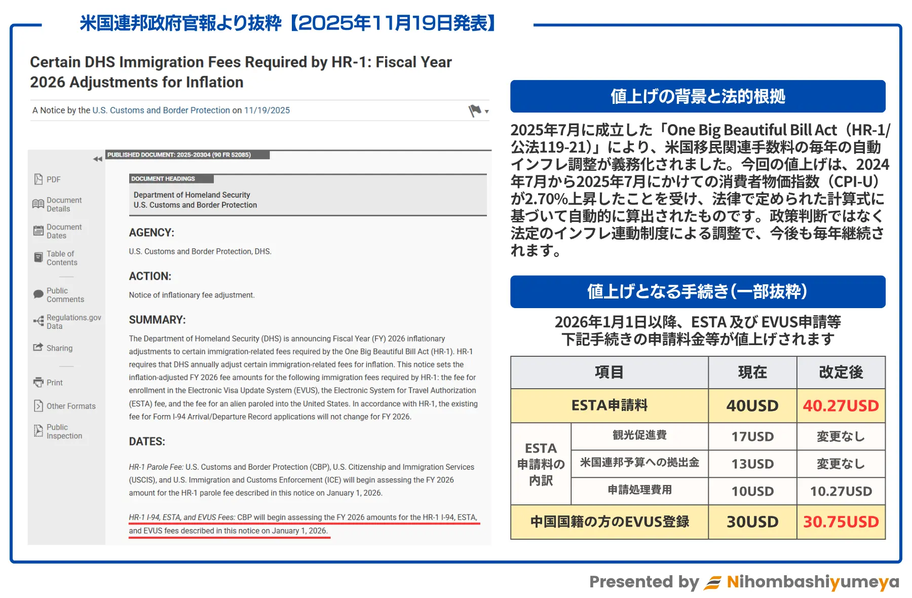 簡単に言うと「物価が上がったから、アメリカ入国に関係する手数料も少し値上げします」ということなのですが、もう少し詳しく言うと「One Big Beautiful Bill Act(HR-1)」という法律で、「毎年、物価上昇率に合わせて申請手数料を調整しなさい」と決められています(2025年7月に成立したもので、これは自動的な仕組みで毎年必ず行われます)。