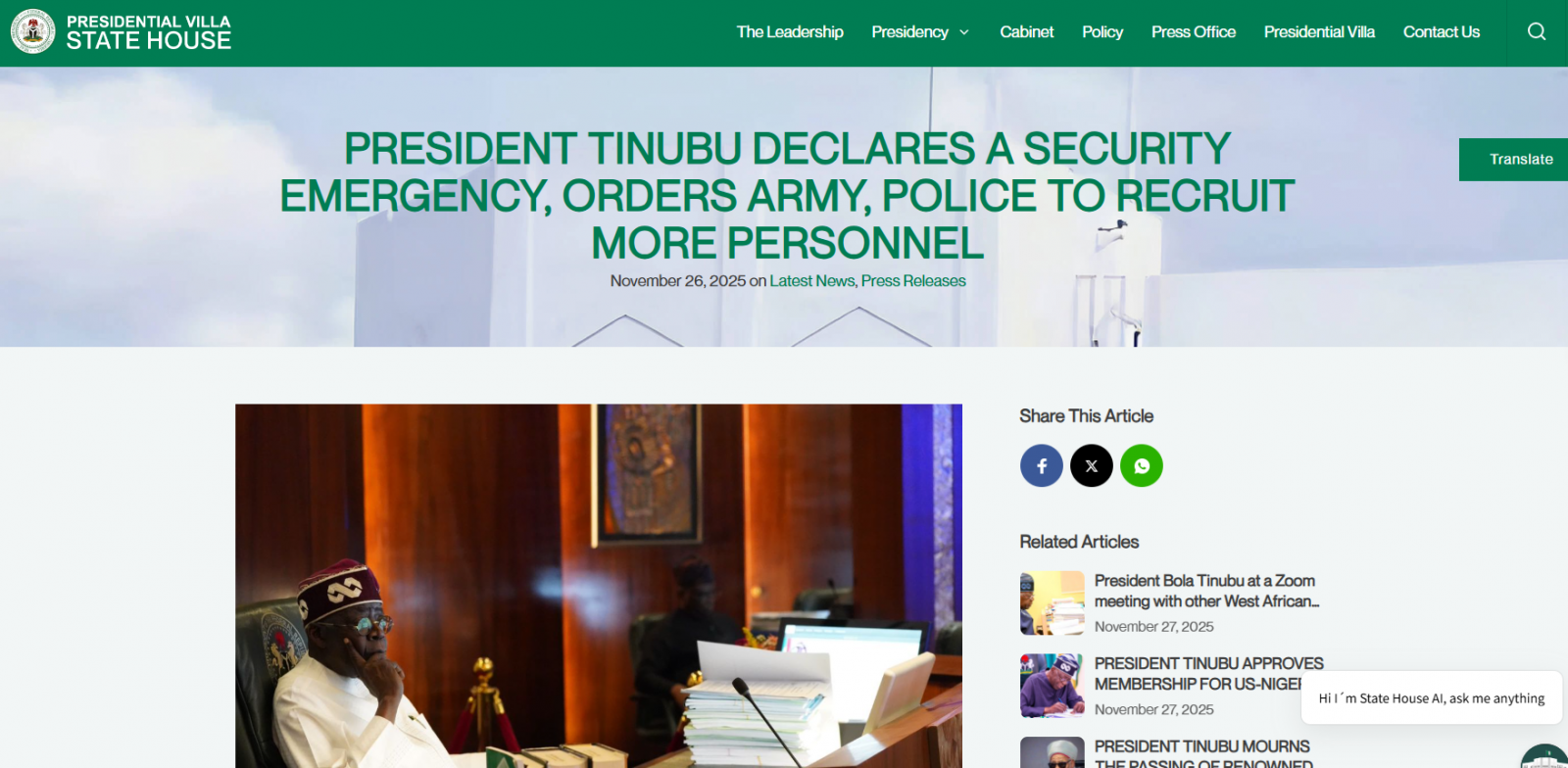 1 ナイジェリア政府は11月26日(水)、最近の武装勢力による襲撃や誘拐事件の多発を受け、全国規模の治安緊急事態を宣言しました。警察・軍の大幅増員、森林地域への警備強化、VIP警護要員の戦地再配置などを含む措置が発表されています。