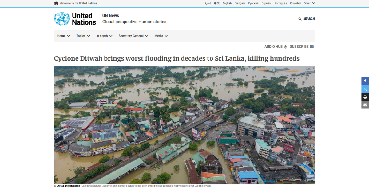 2025年11月30日正午時点での災害対策センター(DMC)の発表によると、直近のサイクロンによる被害はスリランカ全土にわたっており、被災者数968,304人、死者合計193人、行方不明者合計228人となっております。今後の捜索活動等により、更に増加する可能性があります。スリランカは現在、洪水、地滑り、深刻な交通障害が多くの地区で発生し、日常生活に深刻な影響を及ぼしています。