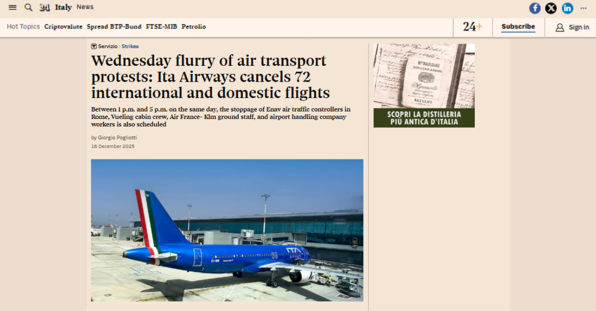 ITA Airwaysは既に72便以上の国内線・国際線のキャンセルを発表しており、ミラノ、ローマ、ヴェネツィア、ナポリ、カターニアなどイタリア主要空港で大幅な遅延とキャンセルが予想されています。