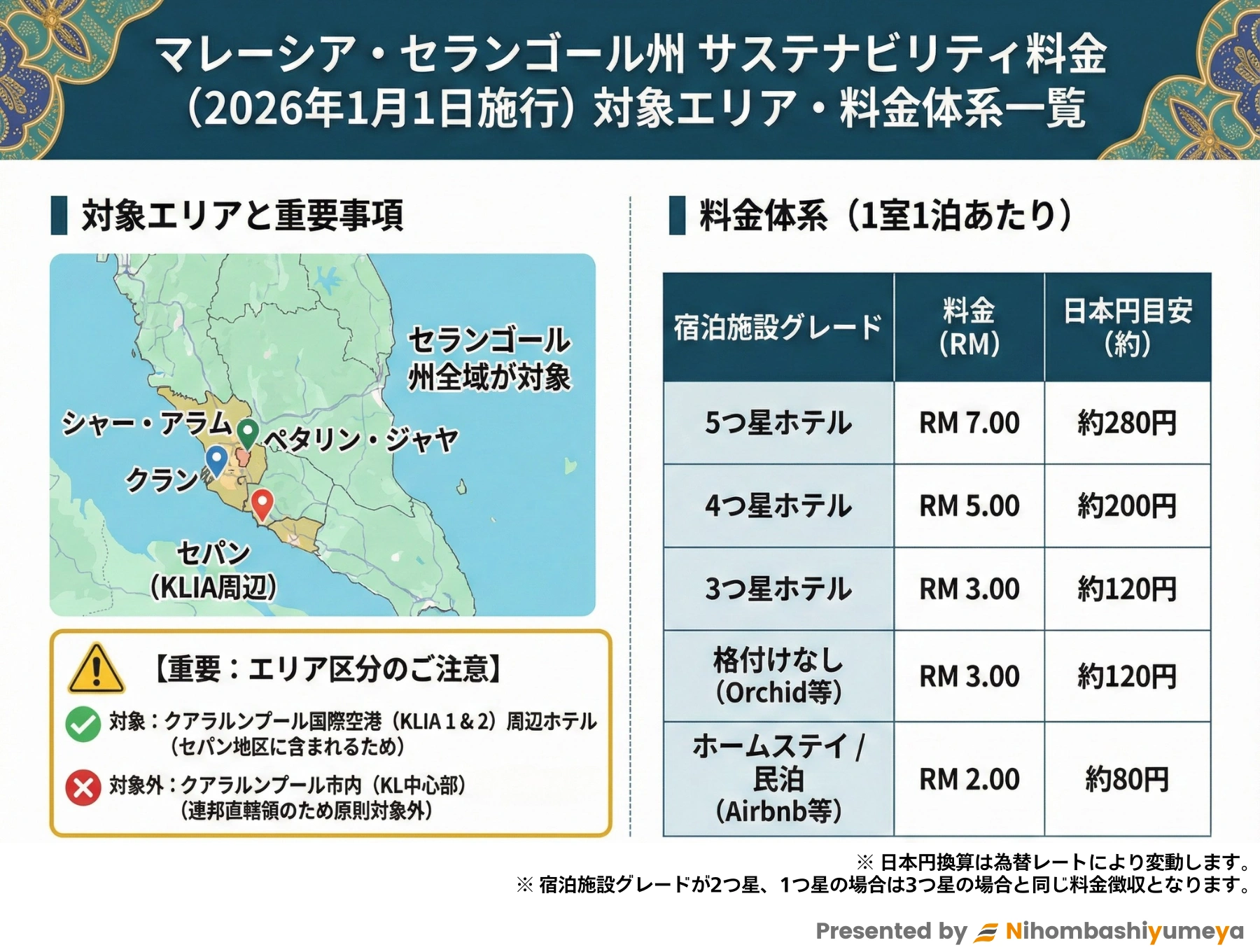セランゴール州内のホテル(特にKLIA空港周辺でのトランジット宿泊や、ペタリン・ジャヤ等のビジネスエリア)をご利用のお客様は、現地での追加支払いが発生しますのでご留意ください。