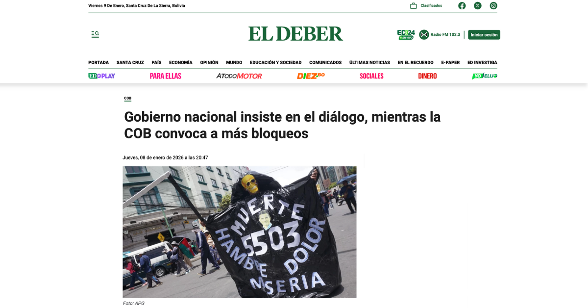 現地報道によれば、最高政令第5503号により燃料助成が廃止されたことに反発する鉱山労働者団体等による抗議行動が続いており、2026年1月8日現在、ボリビア全国で30か所以上の道路封鎖(bloqueos)が発生しています。政府とボリビア最大の労働者団体COB(ボリビア労働者中央組織)との対話は継続していますが、封鎖は各地で断続的に続いており、状況は流動的です。